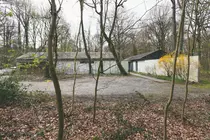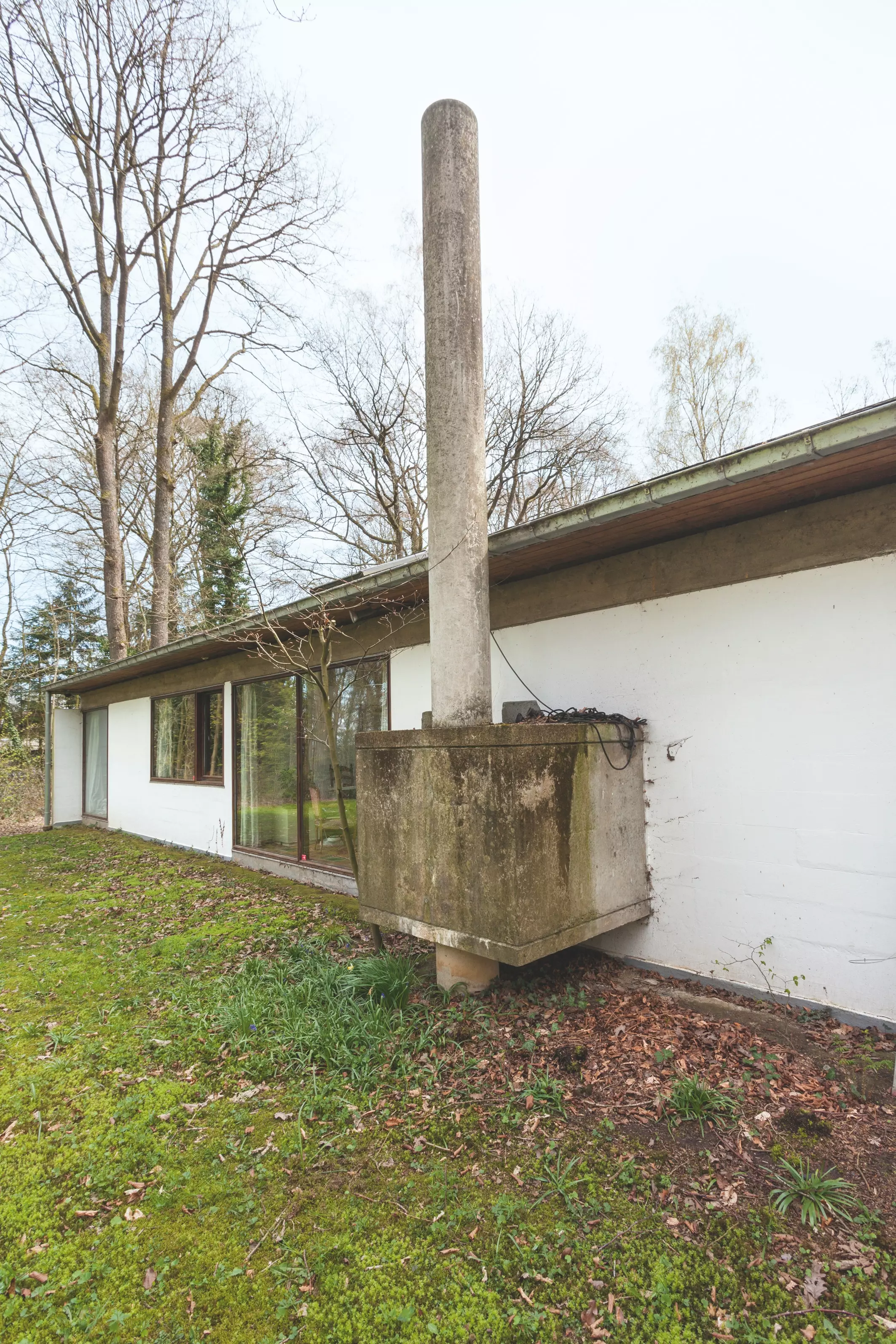 Les toitures à deux pentes des volumes principaux ont été imposées pour l'obtention du permis de bâtir. Elles sont en ardoises noires et sont supportées par des murs de façade monochrome de béton peint en blanc.