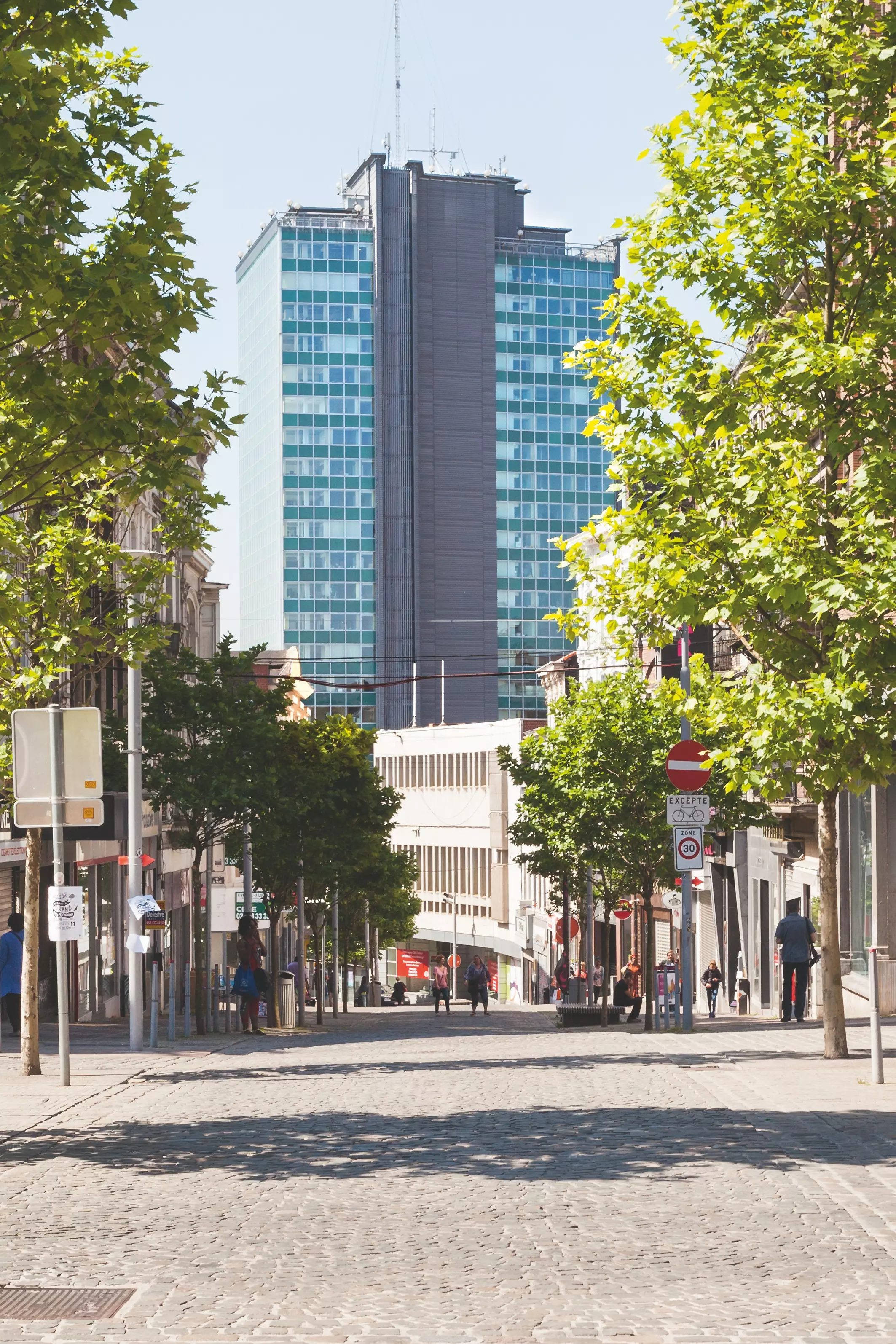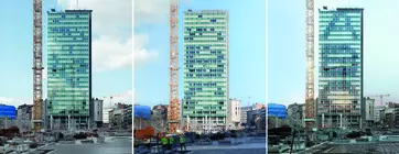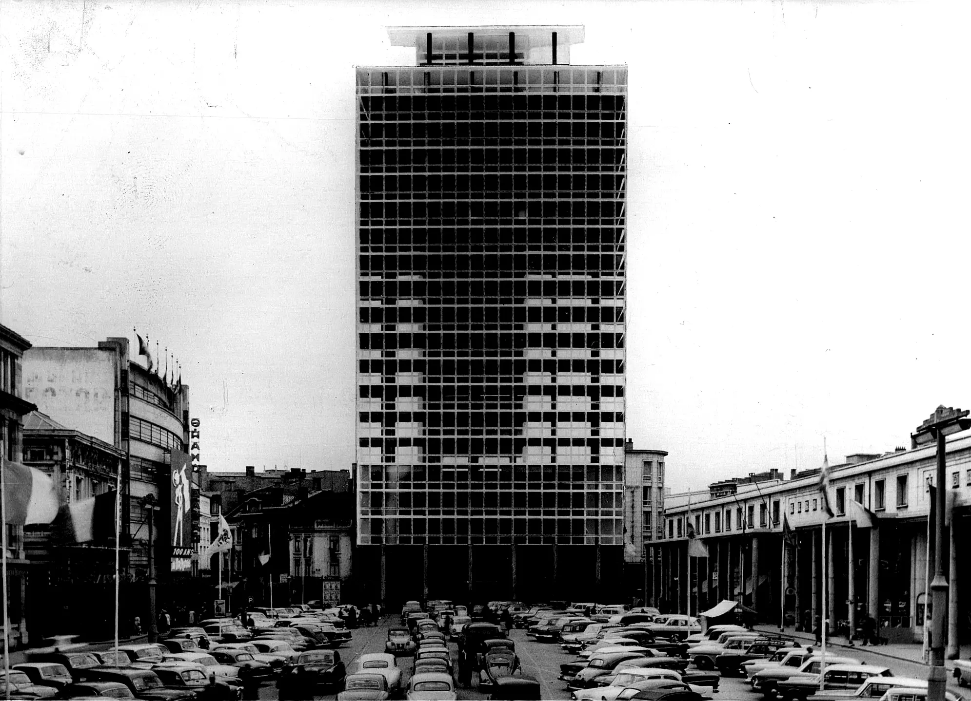 L'immeuble qui, finalement, n'est que partiellement occupé par le ministère des Pensions et la Poste, au rez-de-chaussée, se révélera un échec commercial pour son promoteur, poussé à abandonner la réalisation de l'hôtel Parking, et participera à la faillite de l'entrepreneur en 1973. Inauguré en grandes pompes par le ministre Leburton, le chantier de cette tour de vingt-sept étages, qui, avec ses 83 m, est la plus haute de la ville, s'étale de 1964 à 1967 et voit la mise en œuvre de la technique innovante du coffrage glissant qui permettait de monter le noyau central d'un étage par jour (15 cm/h), un procédé appliqué pour la première fois en Belgique un an auparavant sur le chantier de la tour Madou (Albert Goffaux, 1963-1964) et utilisé au même moment pour la tour Hilton (Henri Montois, 1967).