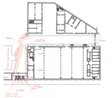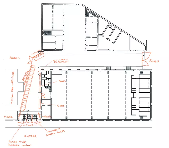 Le parti architectural exprime une démarche expressive pour renforcer la symbolique du lieu. La situation existante a été adaptée, utilisant de manière créative des matériaux industriels. L'entrée, située là où étaient placées les anciennes portes de déchargements, est marquée par une porte pliante en panneaux d'acier perforés.