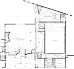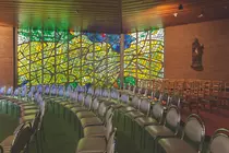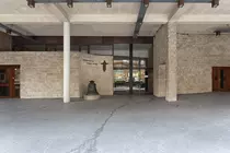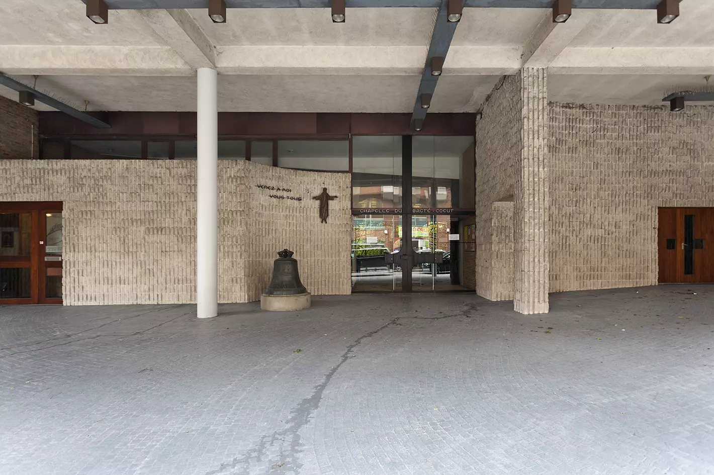 Dans la rue, ce volume attire l'attention et offre une entrée couverte à la chapelle dont le plan carré est atténué par l'introduction d'une série d'éléments aux parois courbes qui organisent l'entrée, le confessionnal et le chœur. Une des parois vitrées de la chapelle est couverte d'un vitrail de la main d'André Bouler.