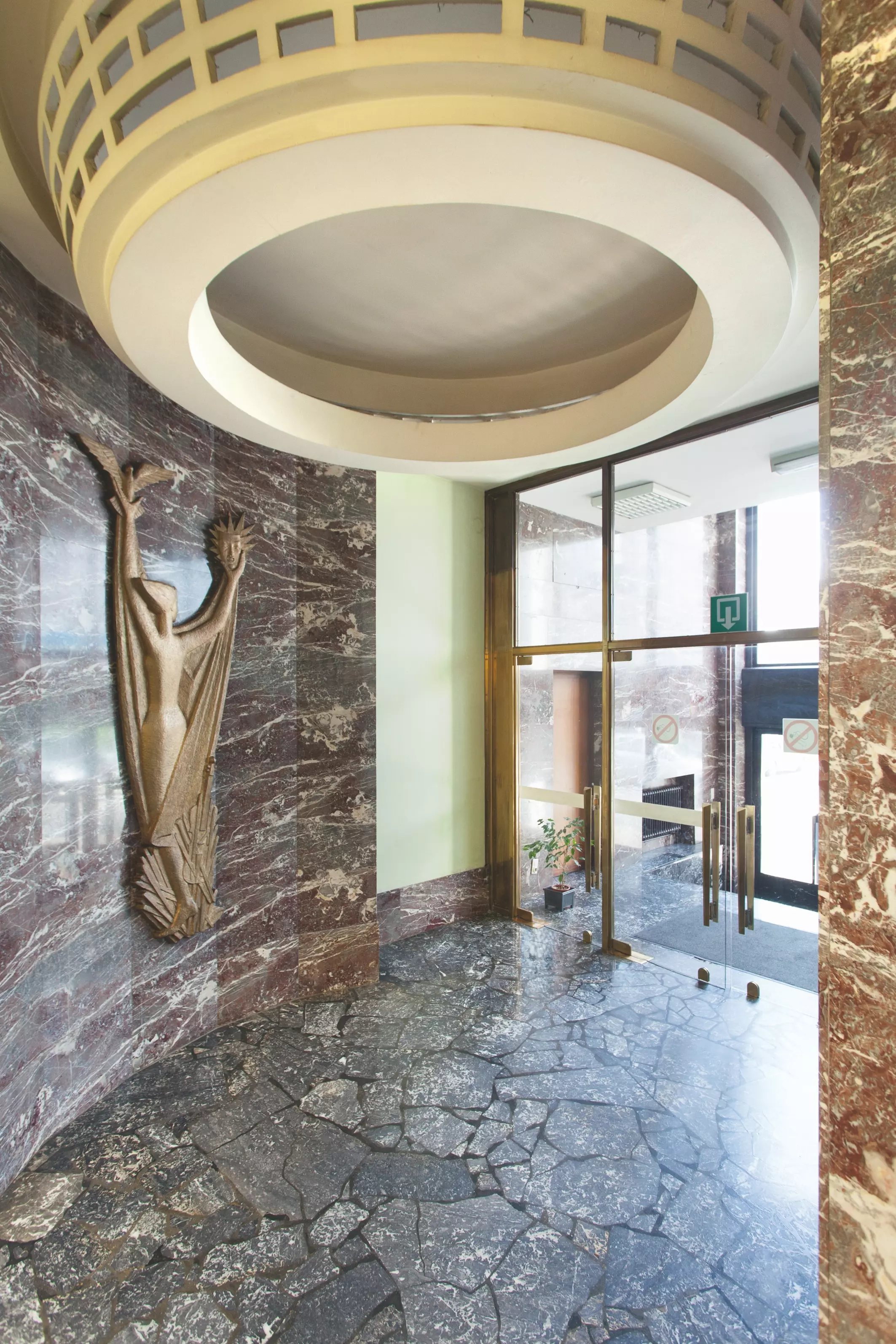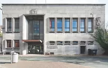 La façade principale, assez étroite en comparaison de la profondeur de la parcelle, ne relate pas le caractère public et l'ampleur du programme. agrémentée de quelques bas-reliefs, elle est en parement de pierre bleue striée et rythmée par des ouvertures à intervalles réguliers dont les encadrements sont en débord.