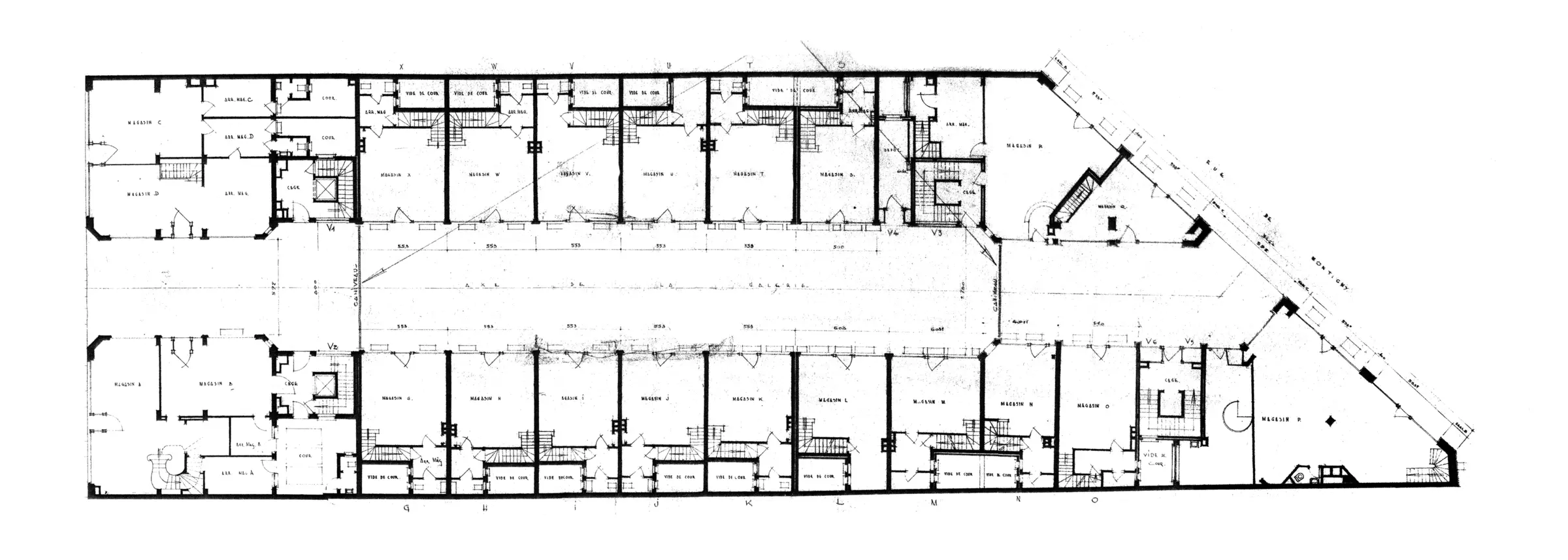 Le dessin des vitrines des commerces développés sur deux niveaux est relevé par l'usage de châssis métalliques, alternant des éléments dorés et peints en vert. Ces éléments rappellent la galerie Ravenstein de Bruxelles construite entre 1954 et 1958 par Alexis et Philippe Dumont, tout en ayant une taille plus modeste.