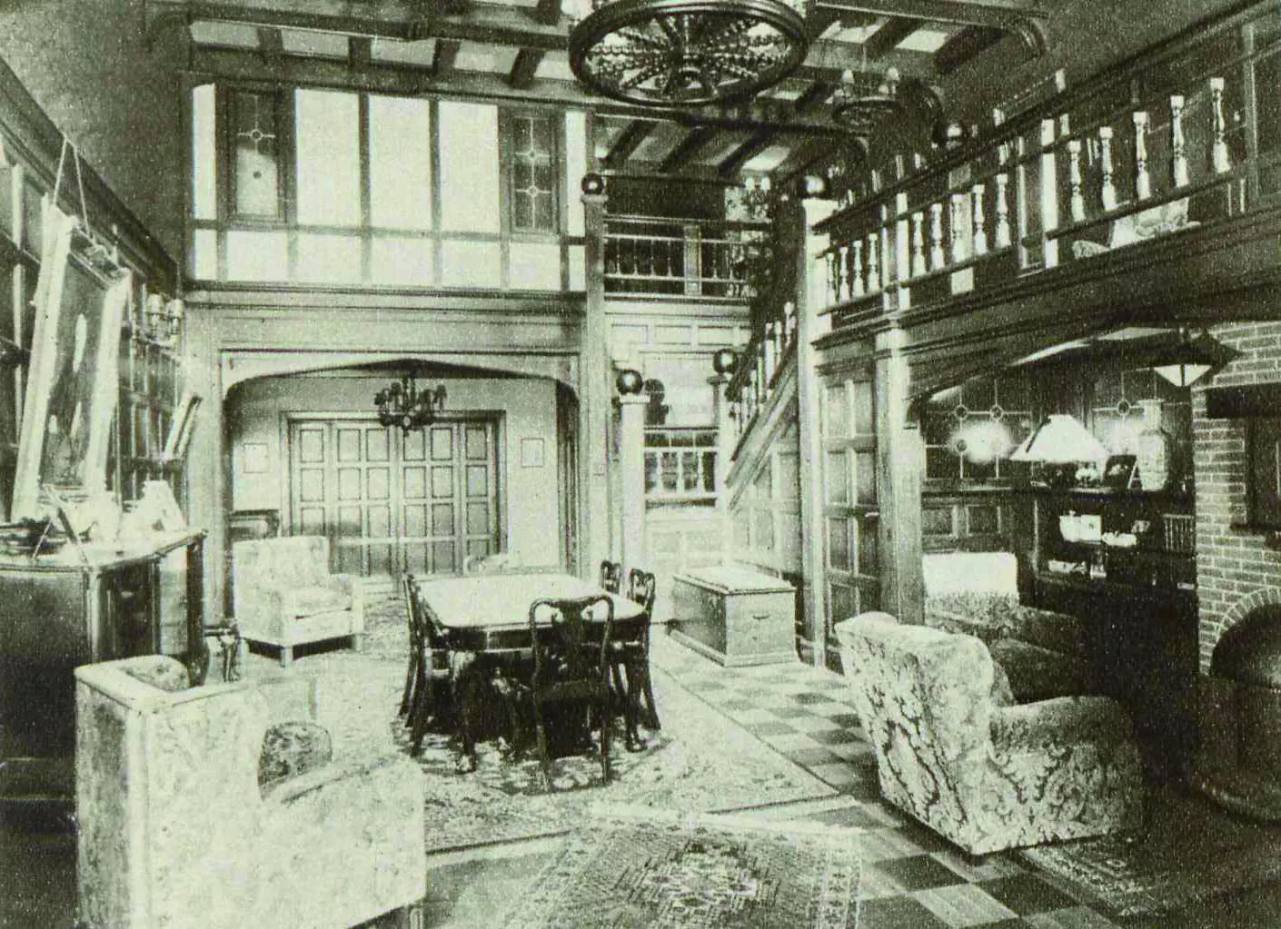 L'organisation intérieure est novatrice. Elle rompt avec le principe du plan en enfilade et s'inspire plutôt de l'agencement spatial plus intimiste des cottages à l'anglaise : la cage d'escalier est intégrée au sein même de la grande salle de famille qui devient le cœur de l'habitation. Cette vaste pièce s'élève sur deux niveaux et la galerie aménagée en mezzanine permet une interpénétration avec l'espace familial. Cette ouverture traduit l'évolution des modes de vie et le rapprochement des liens familiaux. La verrière en hauteur permet également un apport de lumière et d'ensoleillement qui sera une source de recherche chez l'architecte. Avec ses murs lambrissés de boiseries et de revêtements à reliefs Lincrusta, sa cheminée à colonnes torsadées, l'équipement intérieur oscille entre l'ambiance rétro du style de la néo-Renaissance et la stylisation Art déco dont témoigne l'escalier en bois ponctué d'ornements sphériques.