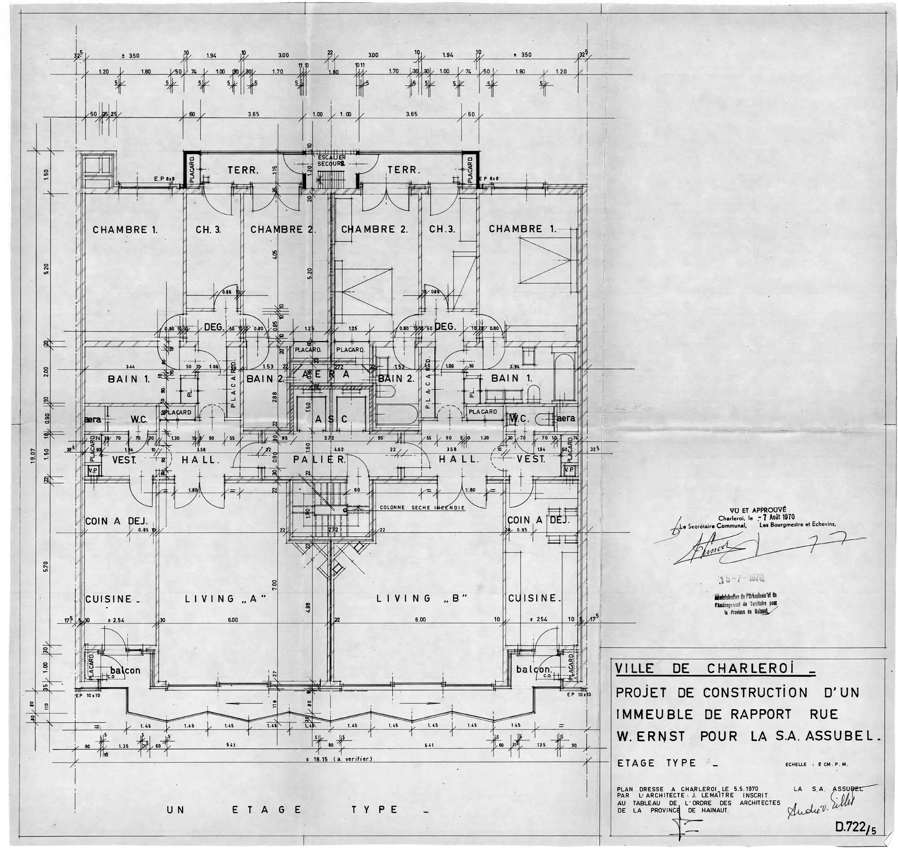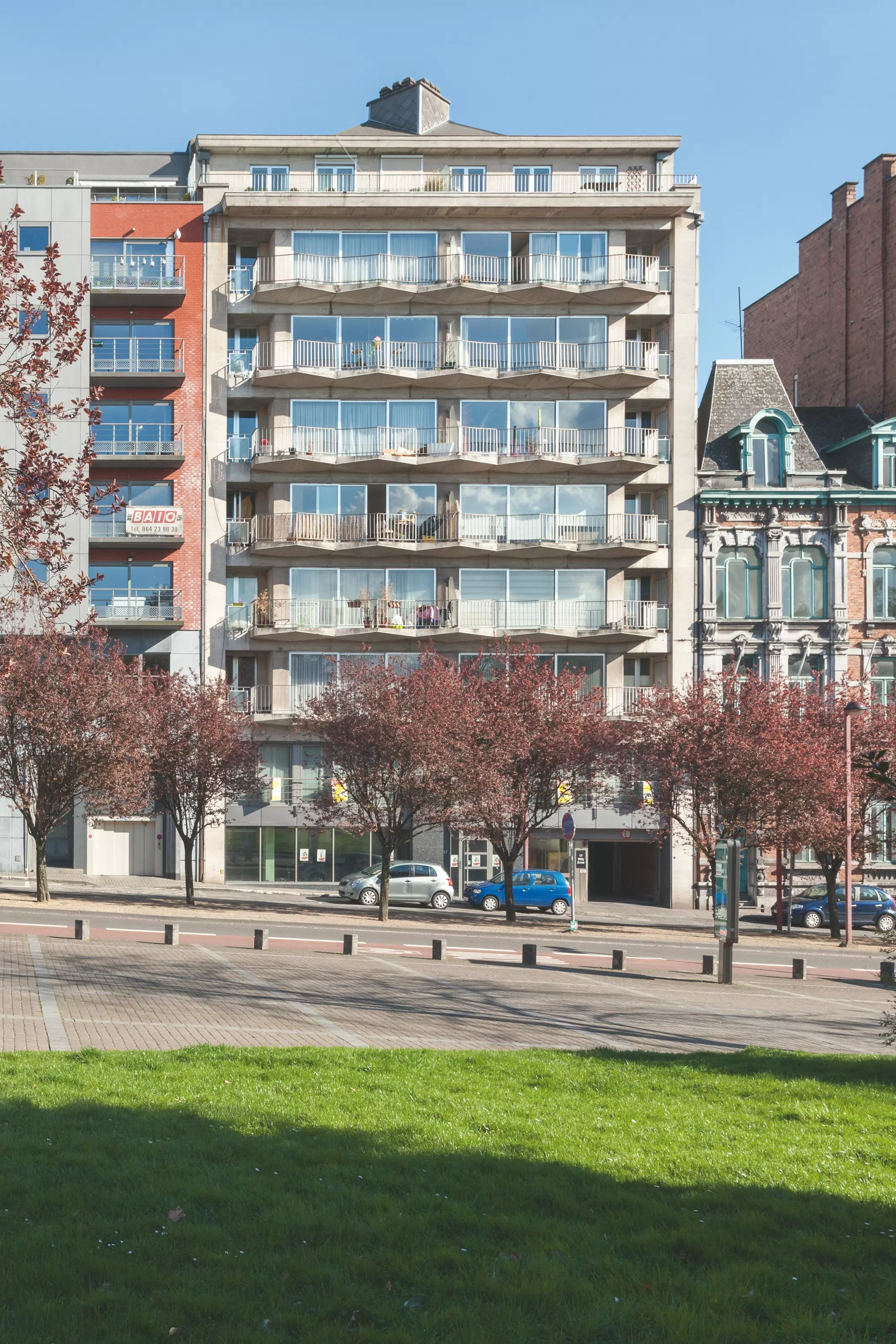 En 1970, le projet est finalement confié à l'architecte liégeois J. Lemaître. Le bâtiment, de quelque 27 m de haut, accueille deux logements par étage sur les sept niveaux supérieurs. Organisés symétriquement, les appartements offrent des espaces de vie généreux ouverts sur des balcons filants triangulaires, côté rue, et des espaces de repos, à l'arrière, plus modestes.
