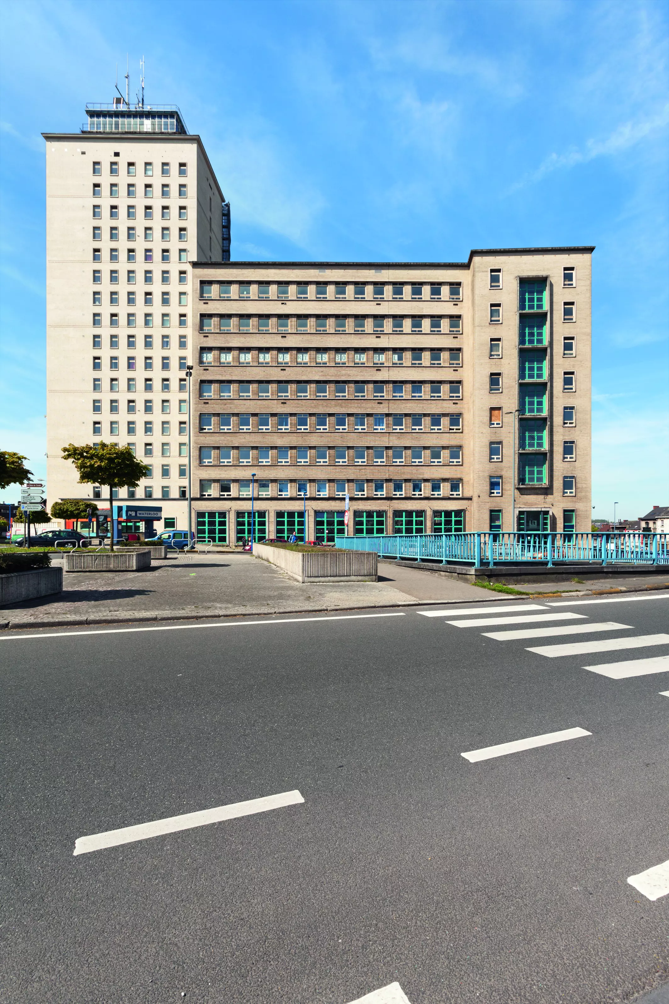 Les deux architectes du Service technique des bâtiments et constructions de la Province, auteurs d'intéressants bâtiments à Mons et Tournai, développent un langage rationnel, appuyé par le parement en briques jaunes. Implanté en U, le bâtiment comporte huit étages sur deux de ses ailes, une tour de dix-huit niveaux, ainsi qu'une aile plus basse de cinq étages. Il est affecté à des logements pour étudiants, ainsi que des bureaux, salles communautaires, réfectoires... Le dernier étage de la tour abrite une salle de réception à vue panoramique et une cuisine, qui sont aujourd'hui peu utilisées.