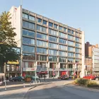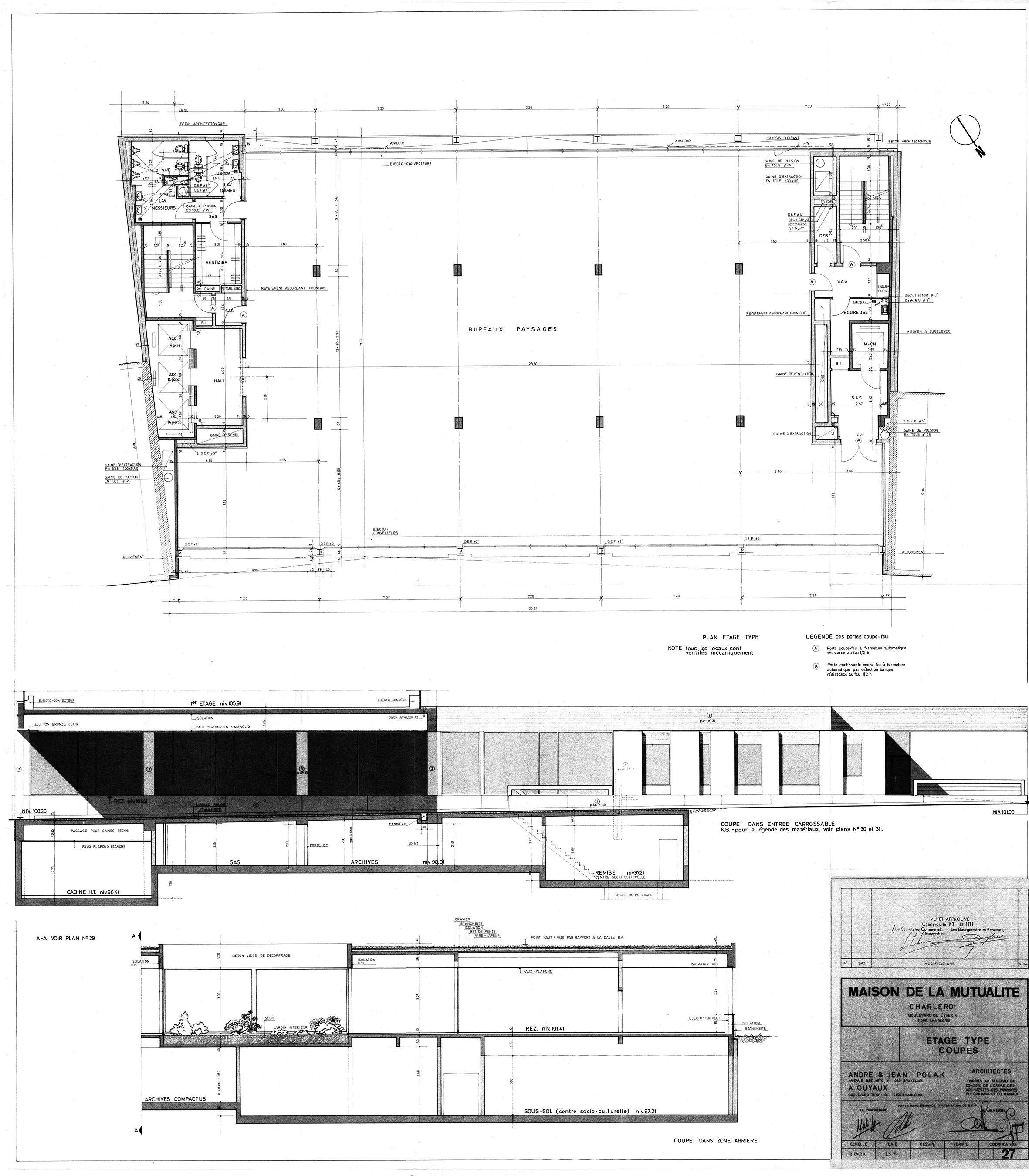Le projet est réalisé avec l'aide de l'architecte local A. Guyaux. Le bâtiment offre au rez-de-chaussée des lieux dédiés à l'accueil du public et au soin des patients organisés autour d'un jardin intérieur. au-dessus, sept plateaux de bureaux se superposent, en plan libre, reléguant les espaces de service et de circulation en périphérie.