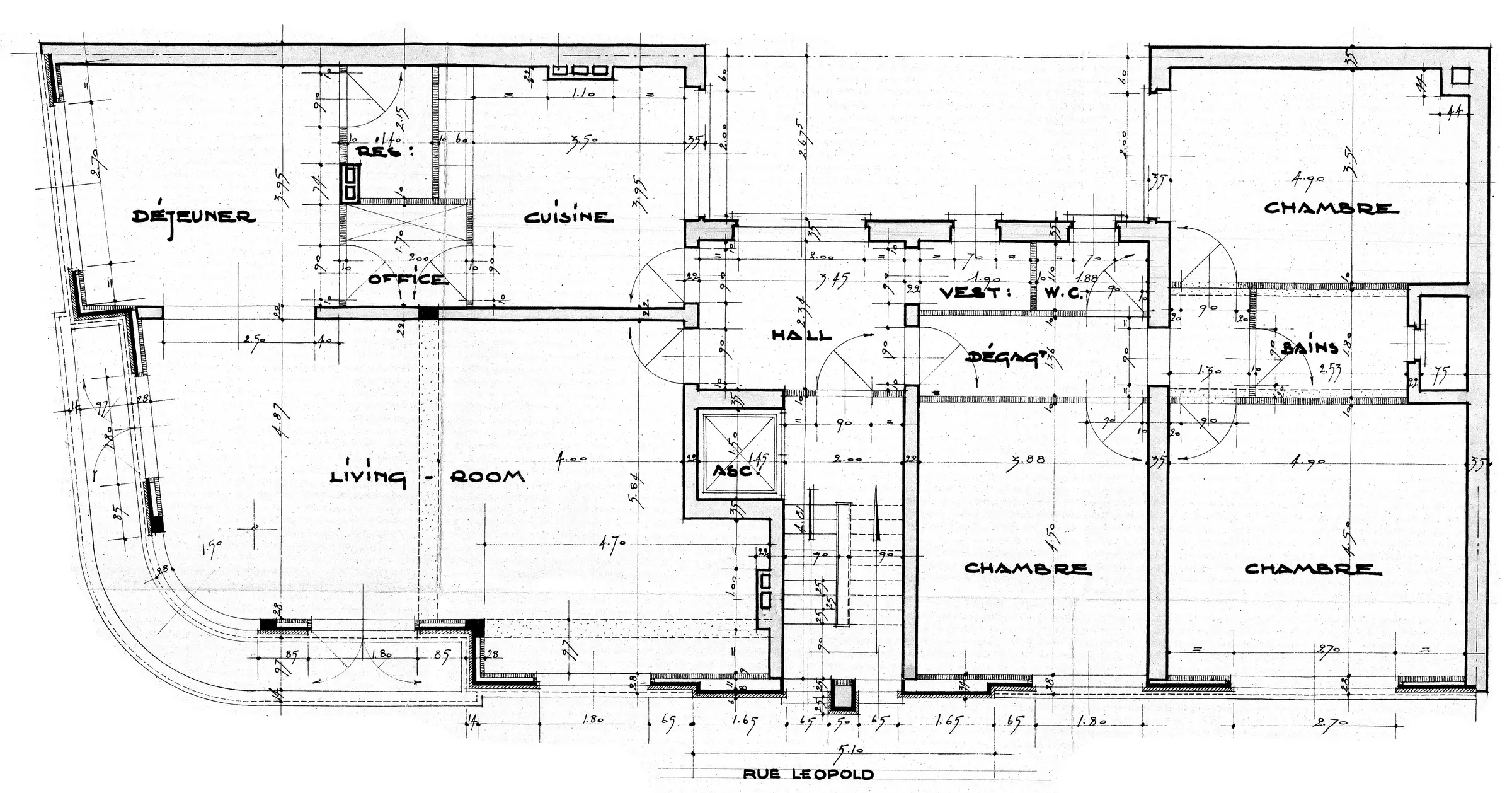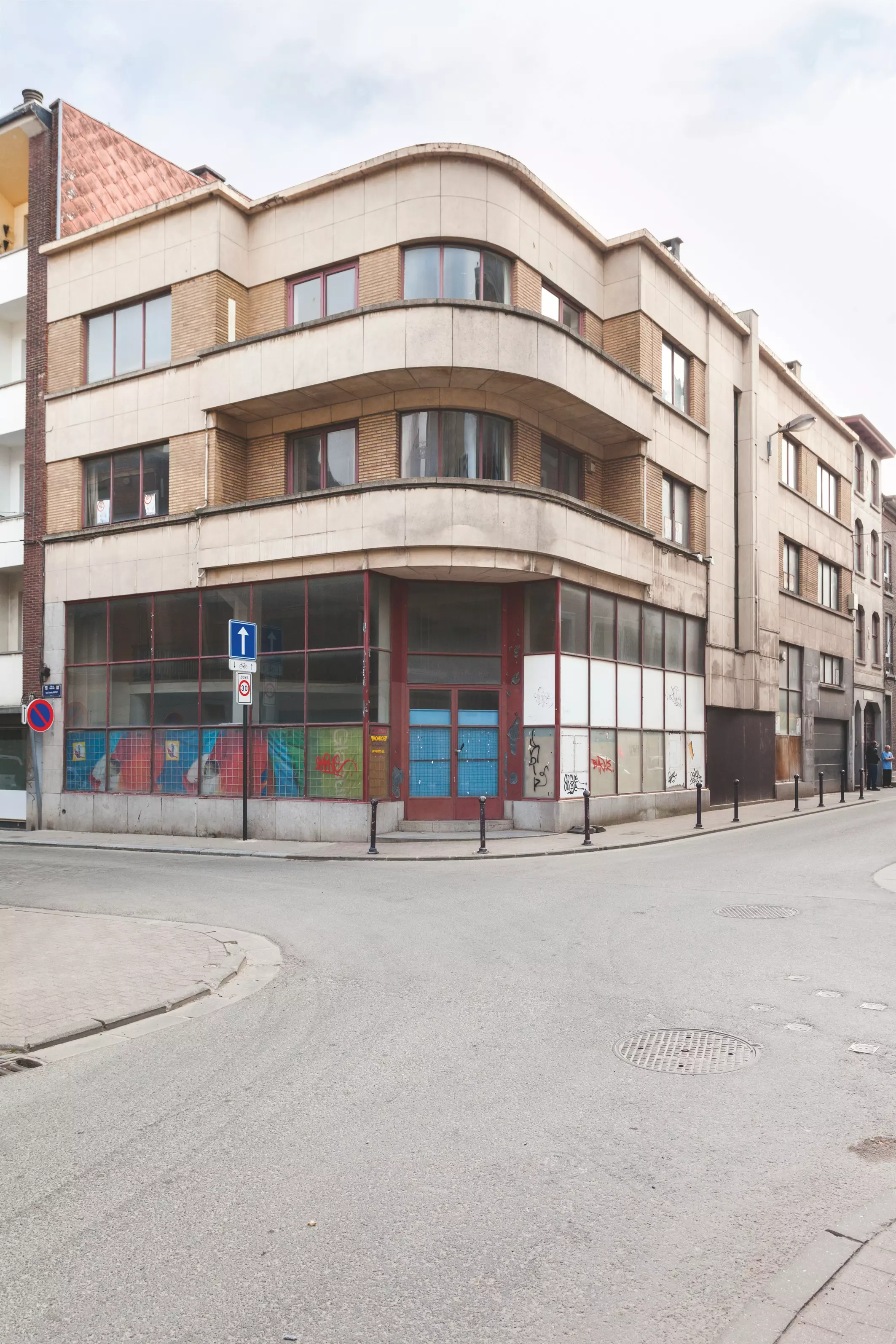 S'implantant sur un terrain d'équerre, ce bâtiment de Marcel Leborgne est peu connu du public. Aujourd'hui à l'abandon, il se compose de trois niveaux associant un rez-de-chaussée commercial et deux étages de logements. Le rez-de-chaussée, percé de larges vitrines aux châssis métalliques, offre des espaces généreux grâce à une hauteur sous plafond particulièrement importante, ce qui permet d'y implanter une mezzanine, optimalisant ainsi les espaces dédiés au magasin. On retrouve dans cette architecture les codes de conception que cet architecte moderniste affectionne. Traité en arrondi, l'angle des étages est mis en valeur par le verre courbe et les garde-corps, ainsi que par les terrasses qui s'inscrivent dans l'alignement de la voirie et qui prolongent les appartements situés à l'angle.