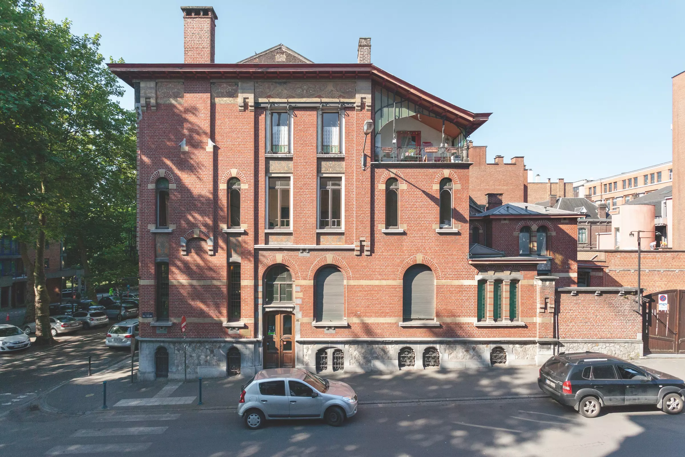Au deuxième étage, une série de quatre fenêtres rectangulaires accolées les unes aux autres est percée et surmontée d'un linteau métallique de façon quasi identique à celle d'Albert Ciamberlani. Le plan du rez-de-chaussée devient absolument symétrique dans les dessins d'Alfred Frère, avec deux fenêtres rectangulaires autour d'une fenêtre en plein cintre surmontée d'un arc brisé, autre élément caractéristique de l'architecture de Paul Hankar.
