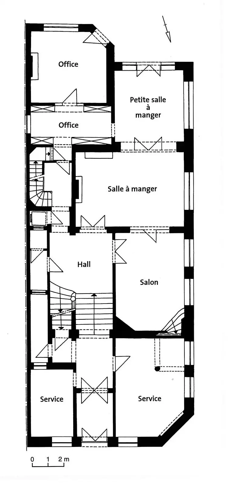 Les espaces privés et professionnels (accessibles par ascenseur) sont placés au bel-étage, de manière à rattraper la dénivellation du terrain. Ils sont distribués par une cage d'escalier centrale, dont les dimensions en font autant un espace de réception, baigné de lumière naturelle par un lanterneau zénithal.