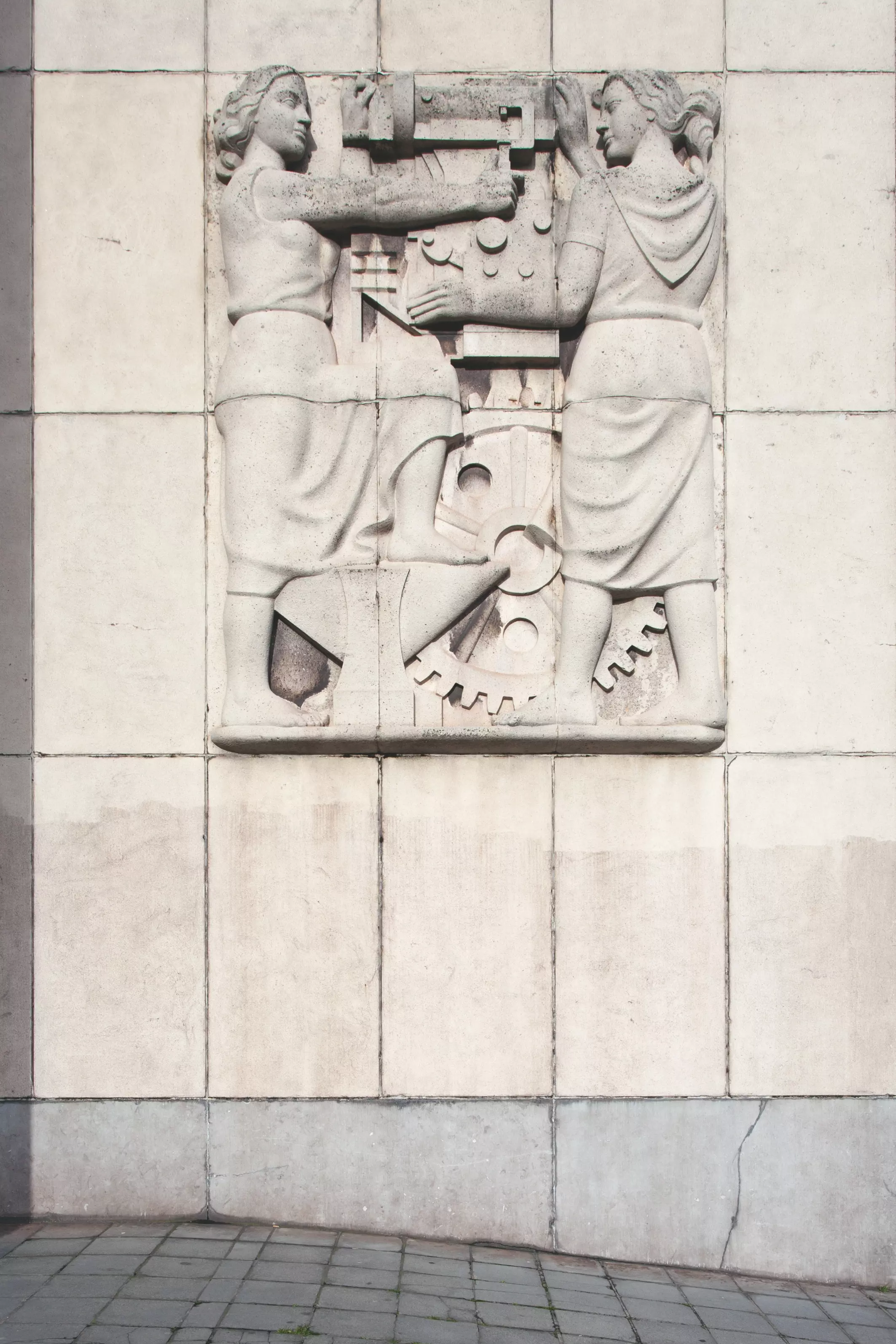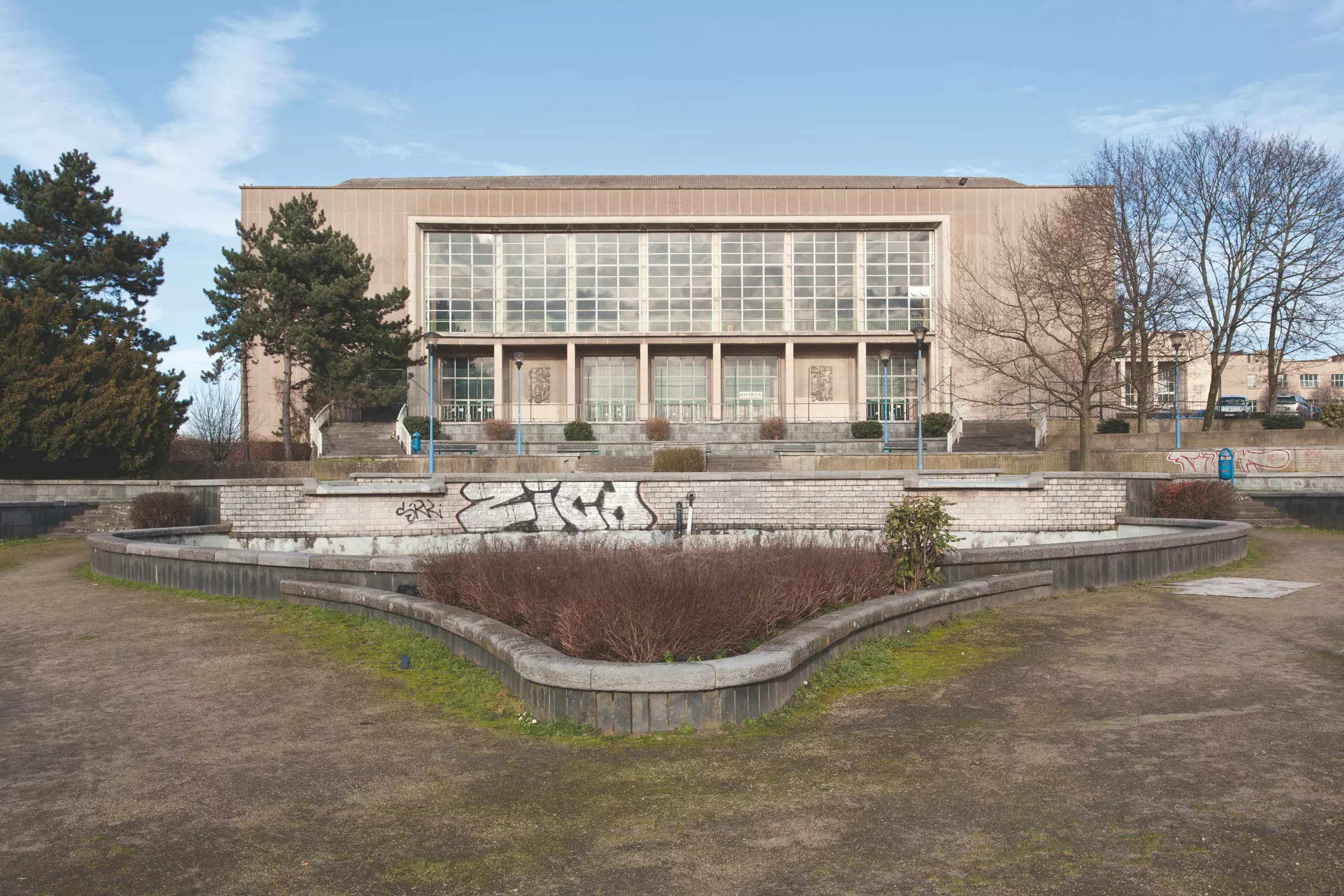 Anciennement, un vaste bowling occupait également le sous-sol du complexe. Fait de béton, d'acier et de verre, le Palais des expositions, d'allure sobre, est une ode à l'essor industriel de la ville et aux techniques de construction de l'époque. L'architecte prend soin de ponctuer les entrées du bâtiment par des bas-reliefs ainsi que par une sculpture de l'artiste Alphonse Darville à l'angle sud du bâtiment.