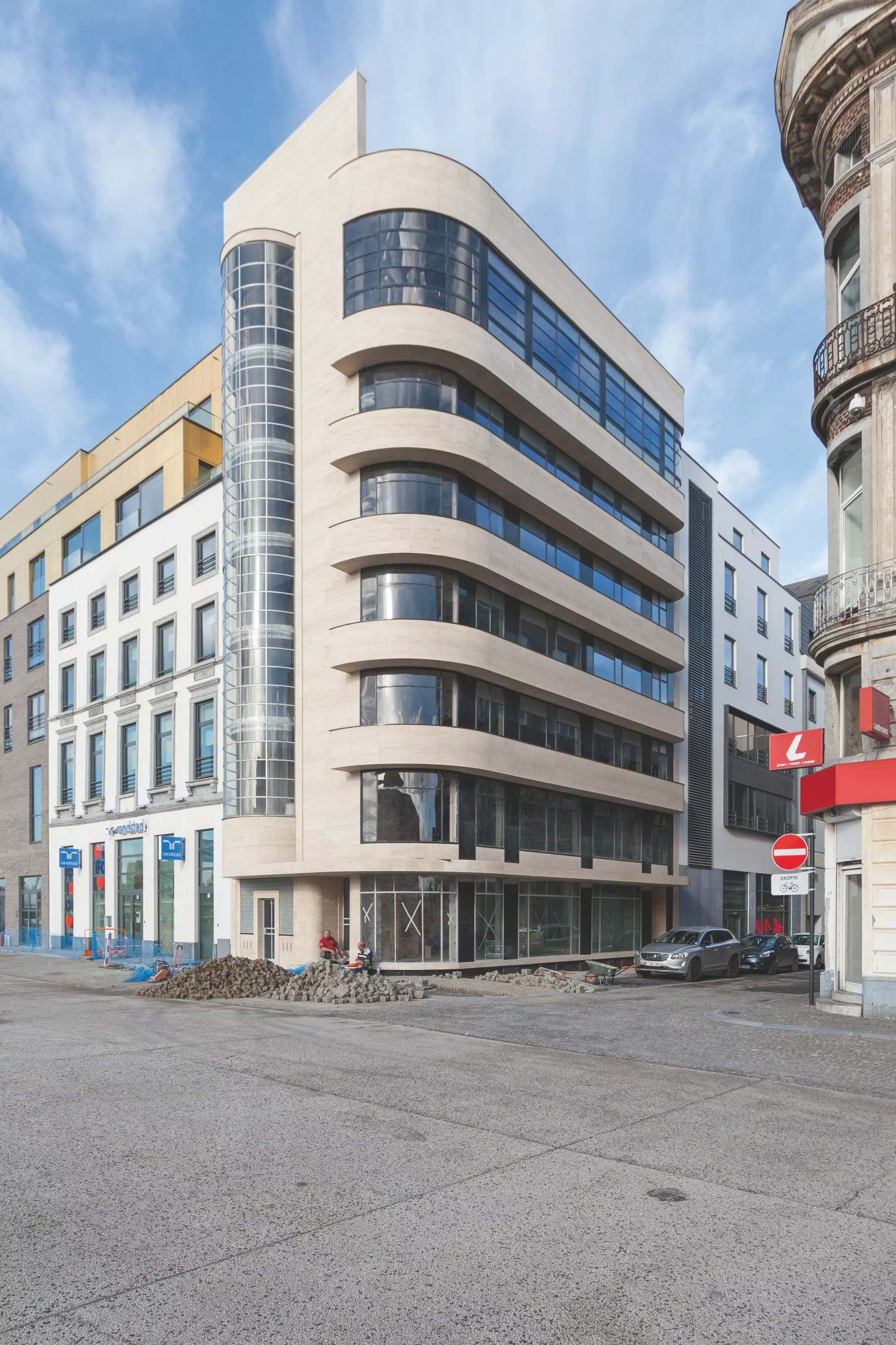 Les différents étages sont desservis par une cage d'escalier circonscrite dans un grand cylindre de verre, se déployant le long de l'ensemble de la façade et marquant sa verticalité. Cet effet est contrebalancé par les balcons qui se déploient et étirent horizontalement la construction. Réalisation contrastée, l'architecte joue aussi avec la matérialité en juxtaposant châssis en métal sombre et marbres de tons clairs. La pierre, de manière assez innovante, a d'ailleurs servi de coffre perdu au béton qui a été coulé après sa pose. Le marchand de pianos quitte les lieux, en 1980, et laisse place à une agence de douane ; l'enseigne « De Heug » est alors remplacée par « Dolisy », nom du nouvel occupant du rez-de-chaussée, le dernier niveau ayant été transformé en logements.