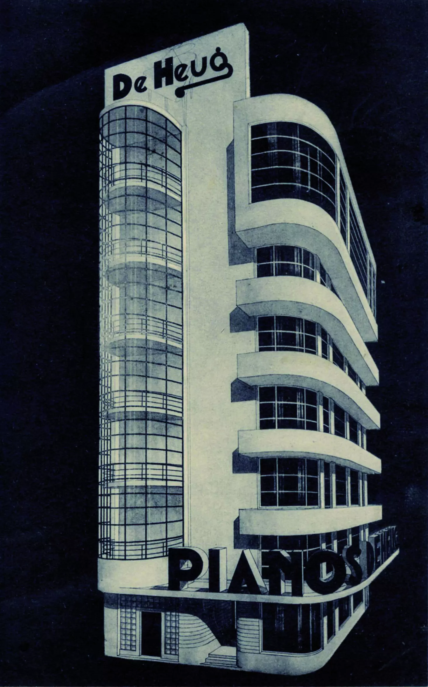 Installé dans un angle, le long du quai de Brabant, cet important immeuble de six étages a été conçu par Marcel Leborgne pour abriter des logements, mais surtout les salles d'exposition, de présentation et d'essais du marchand de pianos, De Heug.