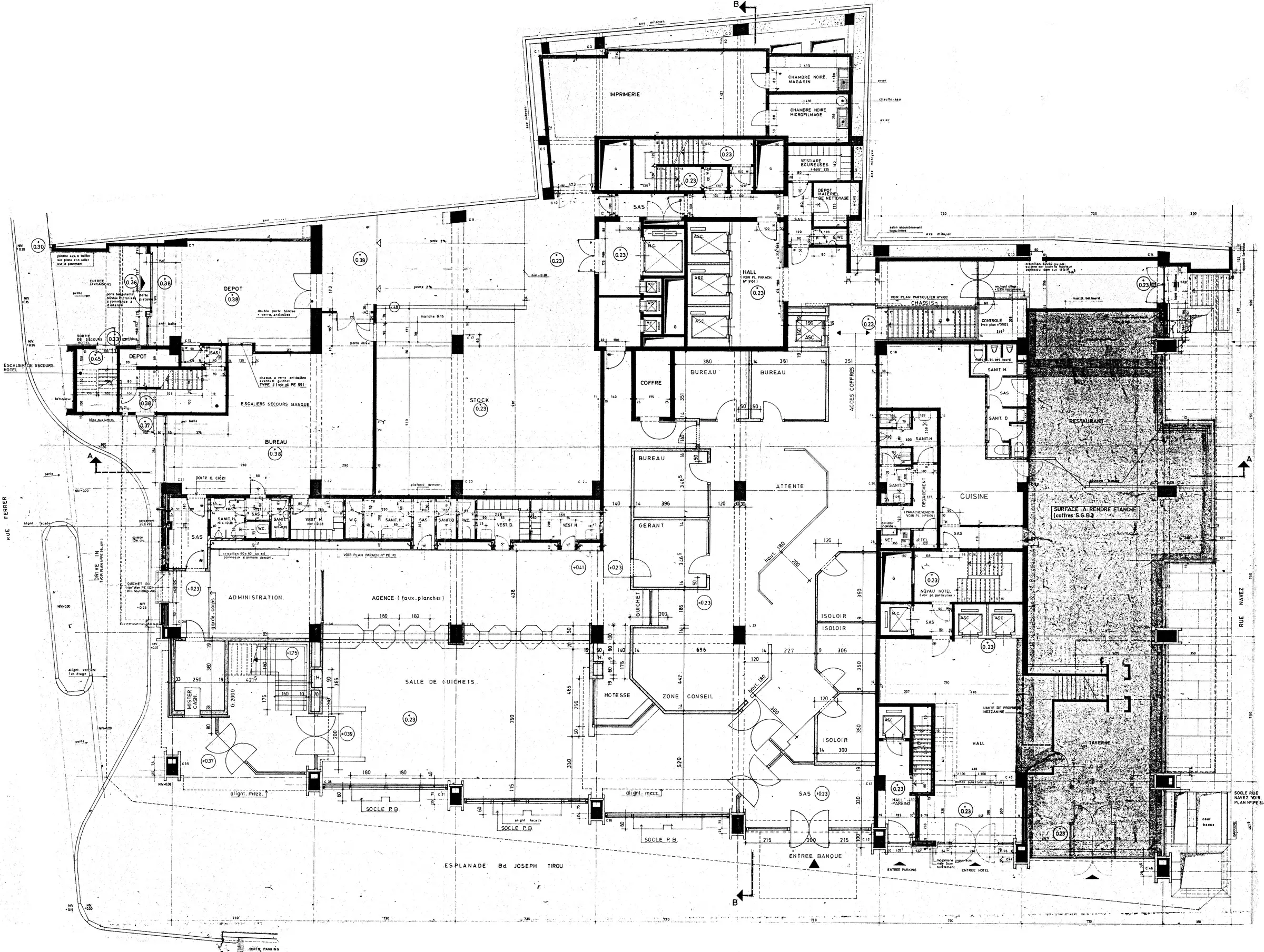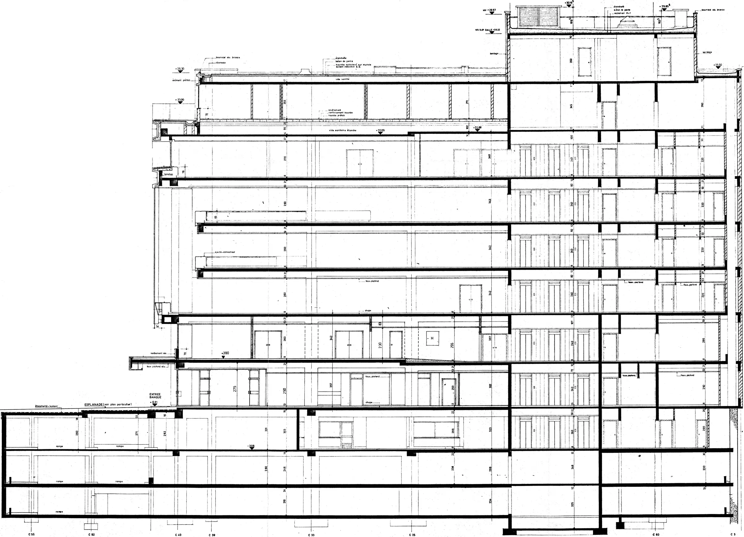 Le socle, occupé par la banque, est entièrement vitré. Afin de compenser l'épaisseur du bâtiment, la façade surplombant le rez-de-chaussée est entièrement dépourvue d'éléments structuraux, littéralement en suspension, selon une technique innovante pour l'époque, depuis le niveau technique qui sépare la banque de l'hôtel.