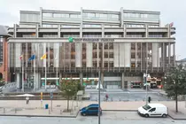 La maîtrise d'ouvrage diffère également, l'opérateur hôtelier ayant eu recours à un autre architecte, Michel Seret, formé en même temps que Paul Hayot à l'école d'architecture Saint-Luc de Bruxelles. La forte matérialité pour laquelle opte Seret exprime l'introversion de l'organisation du plan de l'hôtel, plan organisé autour d'un vaste patio. De même, contrairement à la façade vitrée qui suit la géométrie de la parcelle, l'étage de l'hôtel observe une orthogonalité stricte, qui rattrape l'alignement du boulevard Tirou par une subdivision du volume en redents.