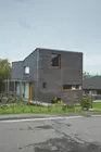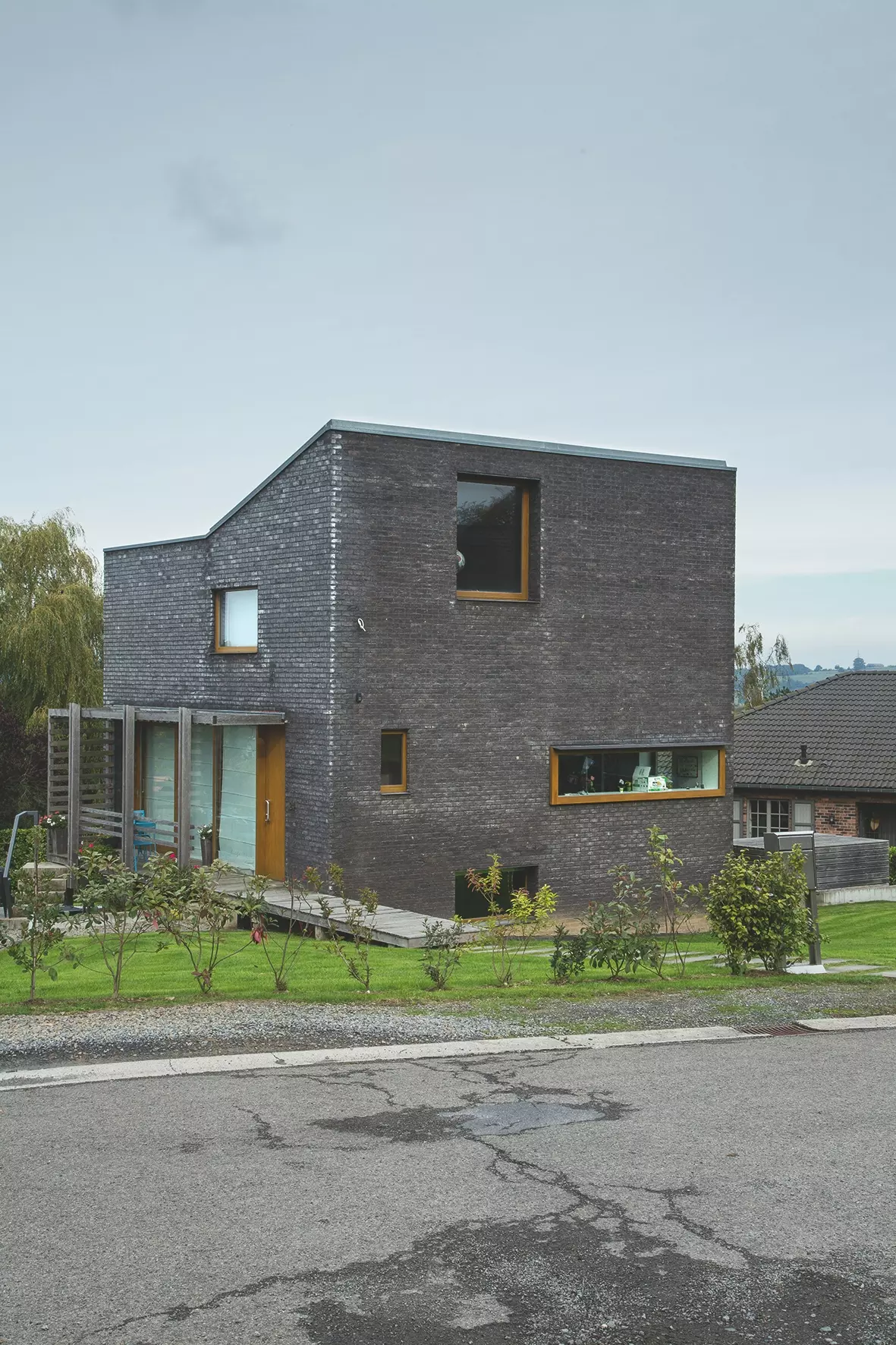 Sur un terrain d'angle, seule parcelle libre d'un lotissement relativement ancien, l'architecte érige une maison unifamiliale compacte (4 chambres et 1 bureau), au budget minimal. Le bâtiment est conçu pour s'intégrer au quartier, en veillant au respect des voisins, tout en s'élevant pour offrir à ses occupants une vue généreuse sur la vallée.