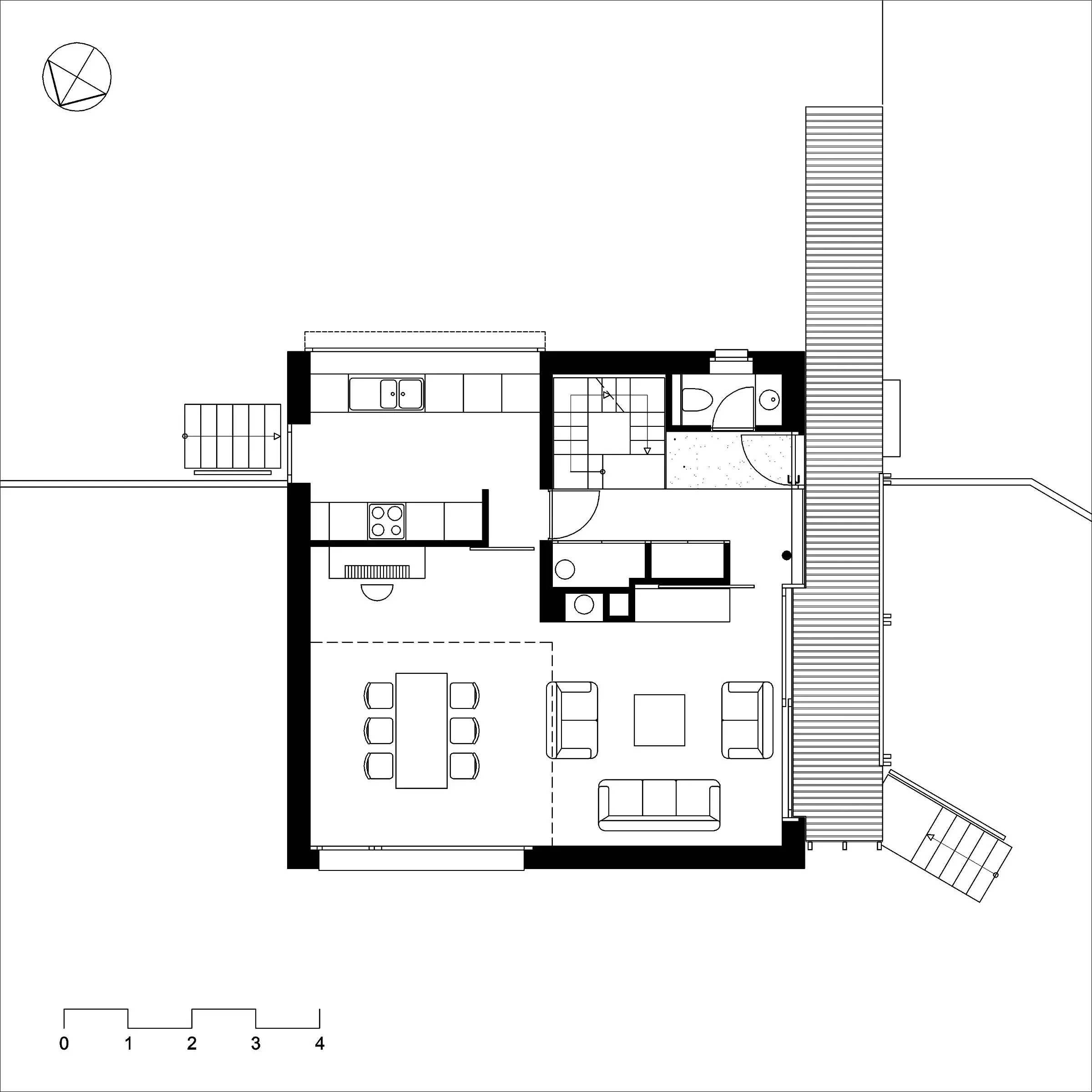 Dans une recherche d'économie, les espaces intérieurs sont organisés de manière rationnelle, sur trois niveaux. Les pièces de vie profitent d'une double hauteur sous plafond, tandis qu'un ponton-terrasse prolonge le séjour. La taille des baies varie selon l'orientation.