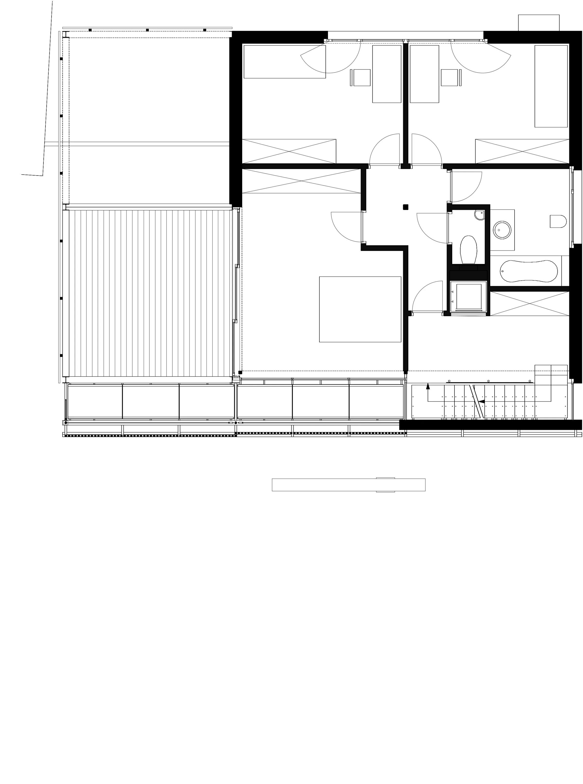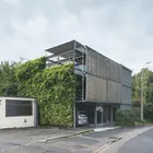Aujourd'hui logement unifamilial, le bâtiment pourrait facilement être transformé en un ensemble de bureaux ou en trois studios. La façade est, entièrement vitrée, est habillée de claustras de bois coulissants afin de garantir l'intimité des occupants, tout en permettant une évolution esthétique. Le côté sud de la maison, tout aussi transparent, est protégé par un claustra fixe où s'épanouit une glycine. Les pièces à vivre s'implantent sous le toit par souci d'intimité, captant les vues et la lumière.