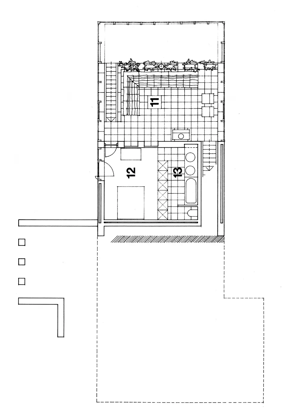 Les abords – escalier d'accès, terrasse-cuisine, murets – accompagnent discrètement le contexte végétal. Le parallélépipède du garage-bureau est la balise qui accueille le visiteur et ancre le projet à la pente. Les escaliers – les seules circulations, car il n'y a pas de couloirs –, les locaux, les rangements : tout s'adapte à l'usage, à la vie dans une structure rigoureusement modulée sur le format des blocs en béton.