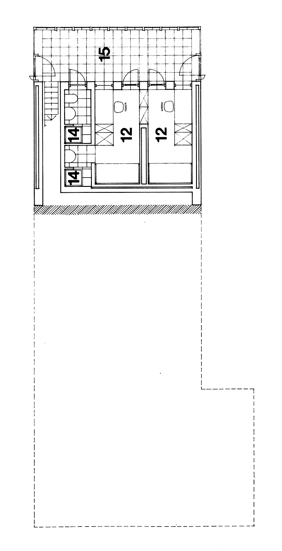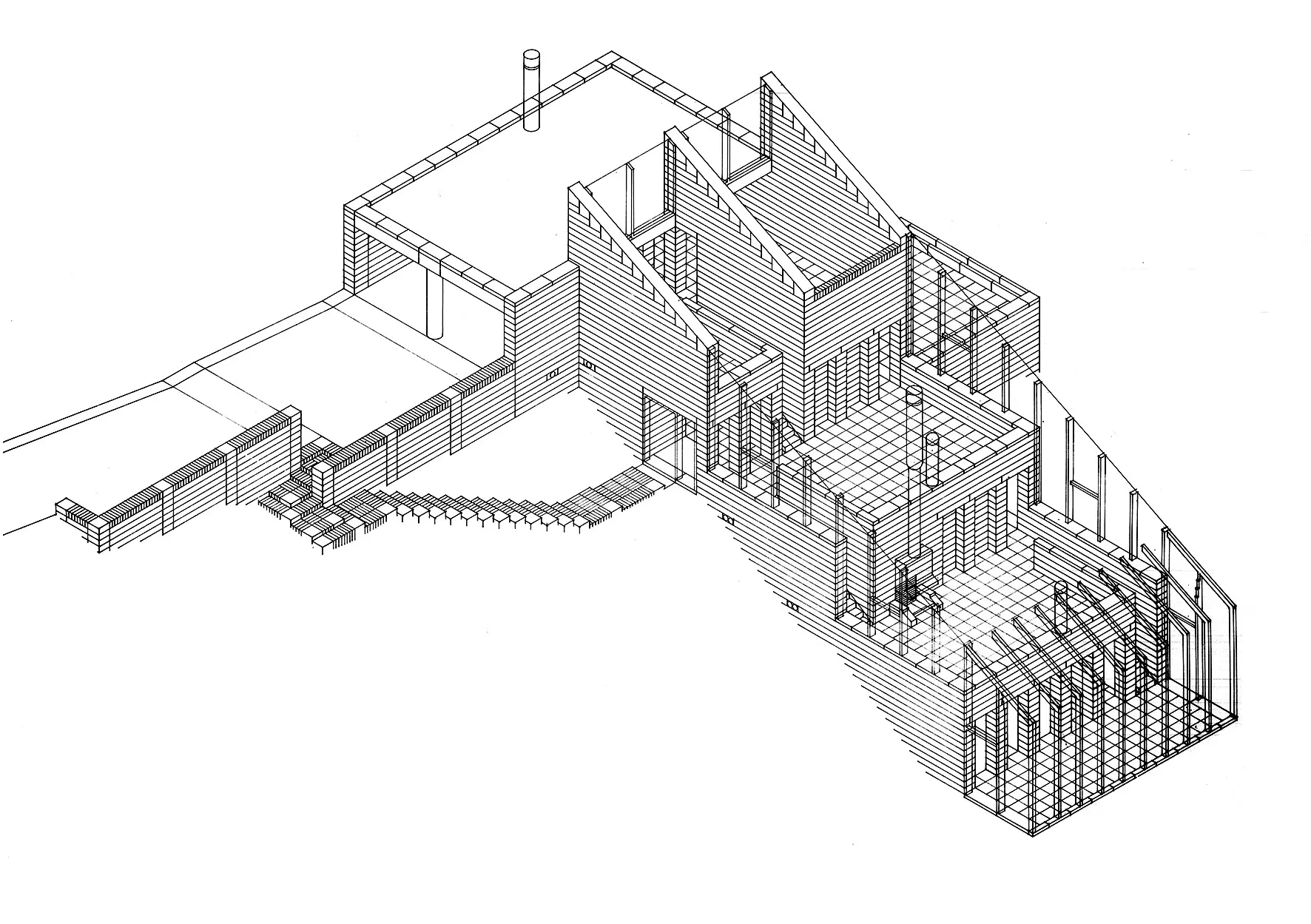 Les zones de vie commune se déploient dans la nature environnante suivant une succession de terrasses en gradins, bien à l'abri derrière des parois vitrées et sous le couvert d'une toiture monopente. Les services et les fonctions privatives s'articulent selon une hiérarchie raffinée sous les terrasses elles-mêmes. Ce dispositif donne à voir un espace unique, continu et fluide : de jour, une pergola, une cabane dans les bois ; de nuit, une grotte toute en reflets.