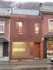Dans cette rue de Chaudfontaine, les maisons ouvrières, traces du passé industriel de la commune, se succèdent. L'une d'entre elles affiche aujourd'hui sa différence : ses propriétaires, architectes, ont choisi de l'habiller d'une tôle d'acier perforée, rouillée et vernie, et d'y installer leurs bureau et logement. Sa couleur la dissimule dans la masse des façades de briques, sa texture la distingue de ses voisines. Sa transparence permet aux passants de percevoir le caractère originel de la construction, tout en lui offrant une identité nouvelle et en garantissant l'intimité des habitants.