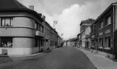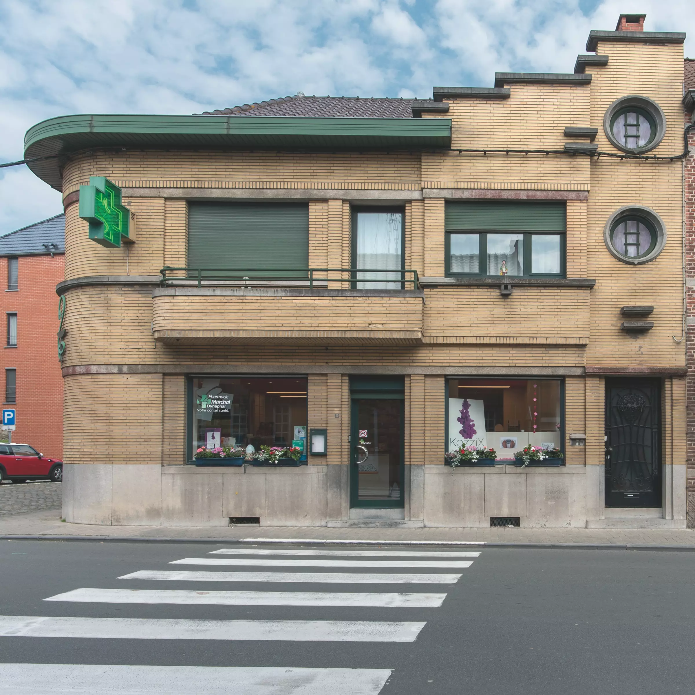 C'est au départ d'une ancienne forge que la pharmacie a été construite. Dans les années 1940, à la volonté du pharmacien Jonas, le bâtiment d'origine est transformé pour trouver sa volumétrie cubique actuelle. Son élévation se découpe en quatre niveaux de briques jaunes, érigés sur un soubassement en béton armé et séparés par des cordons réalisés dans le même matériau. Le rythme horizontal de la rue Hoche est brisé par la courbe acheminée à l'angle de la bâtisse. Au-delà, l'aspect linéaire et plan disparaît dans une composition plus riche et plus articulée, agrémentée notamment d'une balustrade en saillie, de deux œils-de-bœuf ou encore d'imitations de boulins, faisant directement référence au style paquebot. L'ensemble du bâtiment est surplombé d'une corniche de couleur verte, terminée par un profil à redents.