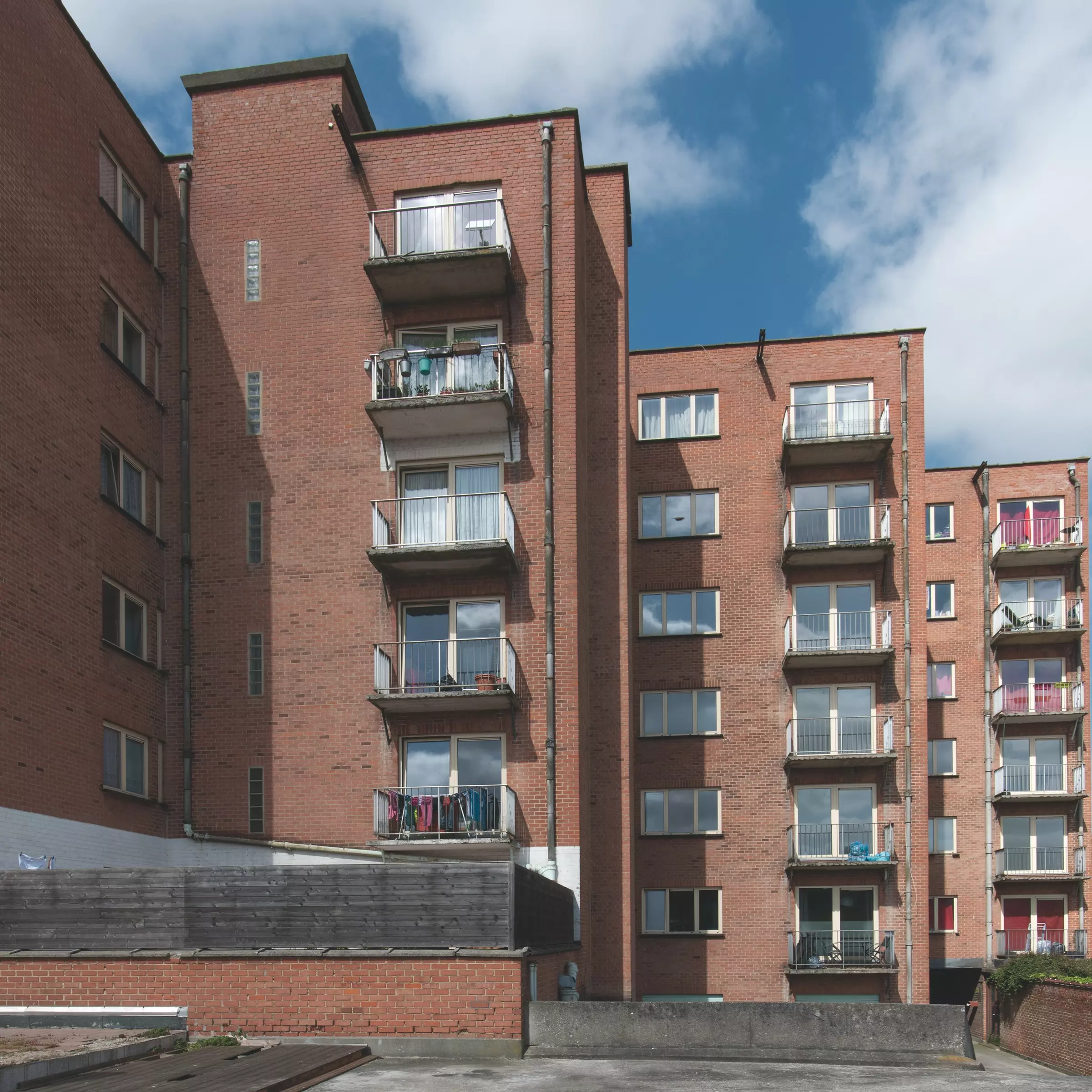 On reconnaît ici l'attrait de l'architecte cominois Moreau pour les lignes héritées du style international : grandes saignées horizontales pour les baies vitrées, auvent en béton armé coiffant le bâtiment, briques de parement oblongues et fines (alternant des quadrilatères de couleur jaune ou grise), le tout reposant sur une petite base traitée en bossage irrégulier. Cependant, sur les façades latérales et postérieures, seules les briques rouges et les structures porteuses en béton armé apparaissent. Afin de garantir une luminosité maximale à chaque appartement, l'architecte a choisi de traiter son bâtiment en trois volumes identiques suivant un décrochement d'un bon tiers de leur profondeur. Cette option permet aussi de limiter les vis-à-vis et confère une forme d'intimité aux habitations.