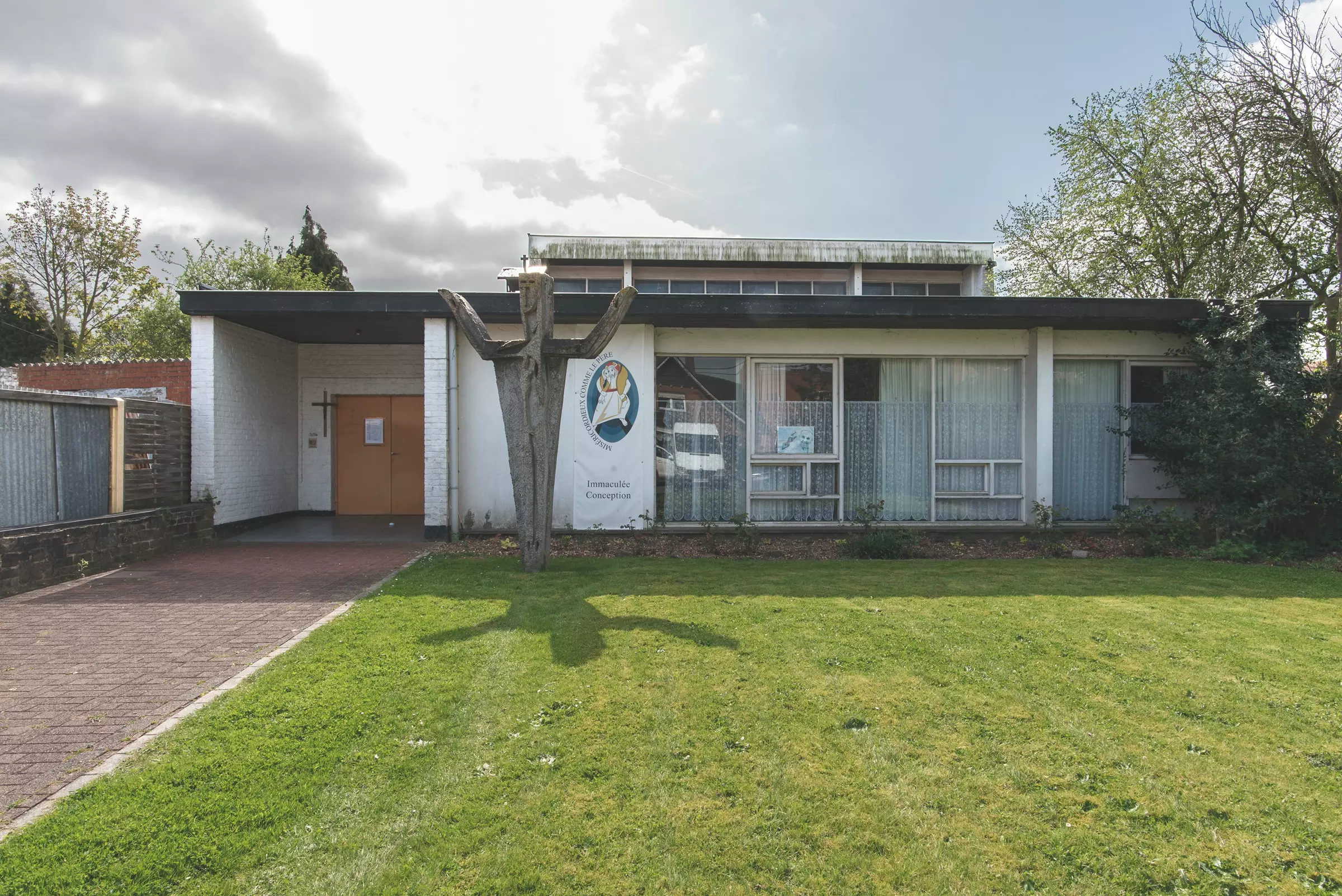 Fin janvier 1959, les plans de l'architecte Vastesaeger se traduisent peu à peu en volumes malgré la forme hostile du terrain, en entonnoir. Devant un parterre, un simple massif d'entrée (donnant discrètement accès à un jardin clos) ouvre sur un parallélépipède (une petite salle polyvalente au mur intérieur tout en briques de verre) et sur la nef de la chapelle, faite d'un toit dont la pente tend vers le chœur, le tout étant soutenu par quatre poutres de bois en lamellé-collé. Le mur latéral est éclairé de vitraux traditionnels et par d'autres baies à calibres éclatés sous béton, tous de la main de Roger Coppe. Une autre verrière occupe tout l'espace entre la plate-forme de la salle paroissiale et le toit de la chapelle.