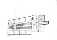 Une longue rampe y distribue deux niveaux de classes primaires ouvertes sur des coursives. À l'about du dispositif linéaire, un plateau vitré forme le foyer de l'école, appuyé contre un volume qui fait contrefort et accueille les classes gardiennes étagées dans la colline verdoyante, distribuées, elles aussi, par une double rampe sous verrière.