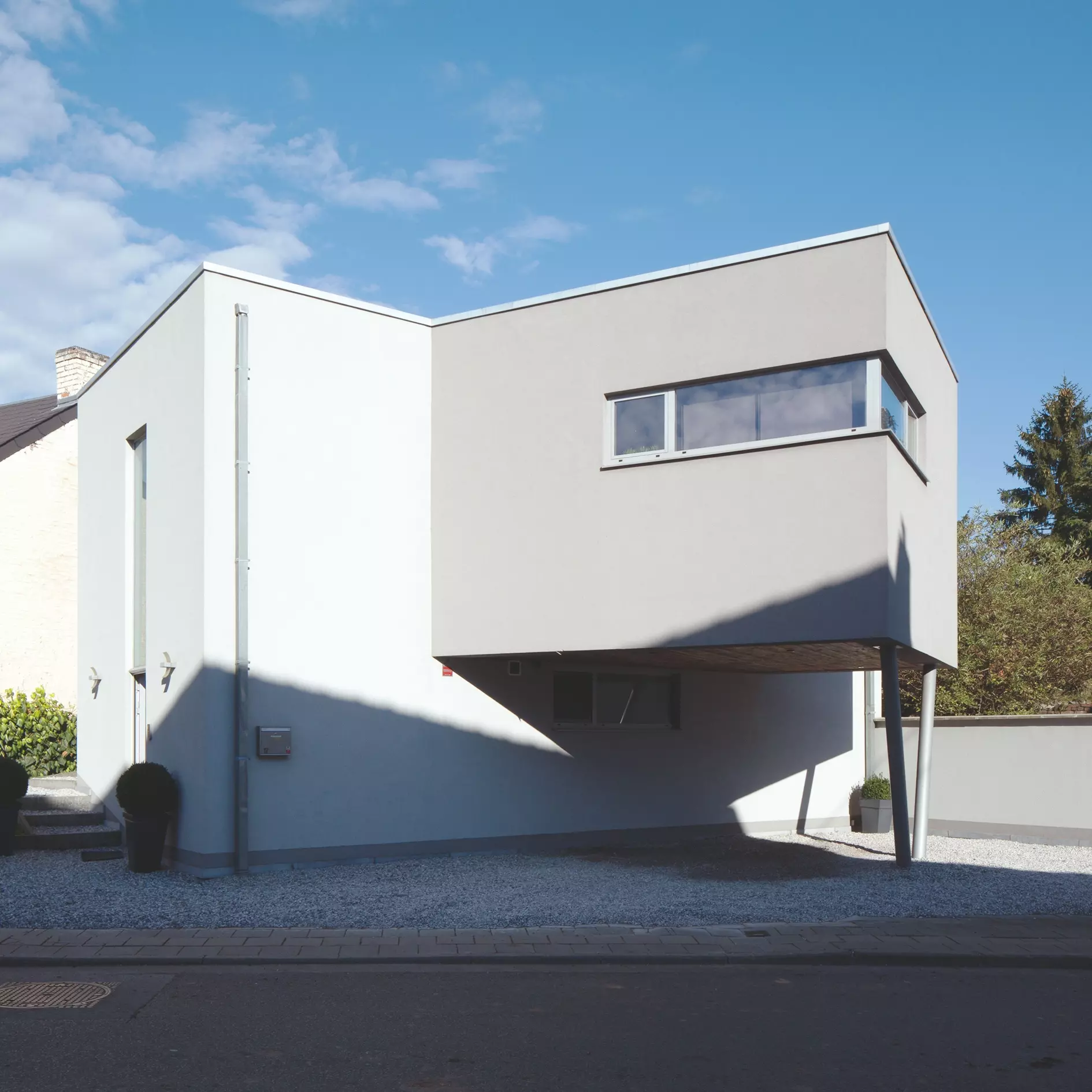 La conception de l'habitation répond à plusieurs contraintes : forme atypique de la parcelle (terrain enclavé en entonnoir), dénivelé entre la voirie et l'arrière, imposition d'alignement en front de voirie. La réponse architecturale tient en la création d'une construction charnière, composée de deux volumes – enduits pour asseoir la construction dans un environnement à l'architecture hétéroclite –, rétablissant l'alignement et le lien avec les bâtiments alentour.