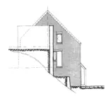 Le volume est simple, en briques brun-rouge, couvert d'une toiture en bâtière d'ardoise grise qui rappelle les typologies architecturales locales. Le traitement des fenêtres s'établit en percements à 45°, accentués par les seuils et linteaux en briques sur chant, l'emploi de baies passantes et d'ouvertures de toiture au faîte. L'éclairement des espaces est optimal, s'organisant autour de la cage d'escalier centrale et de la galerie du living, point névralgique de l'habitation.