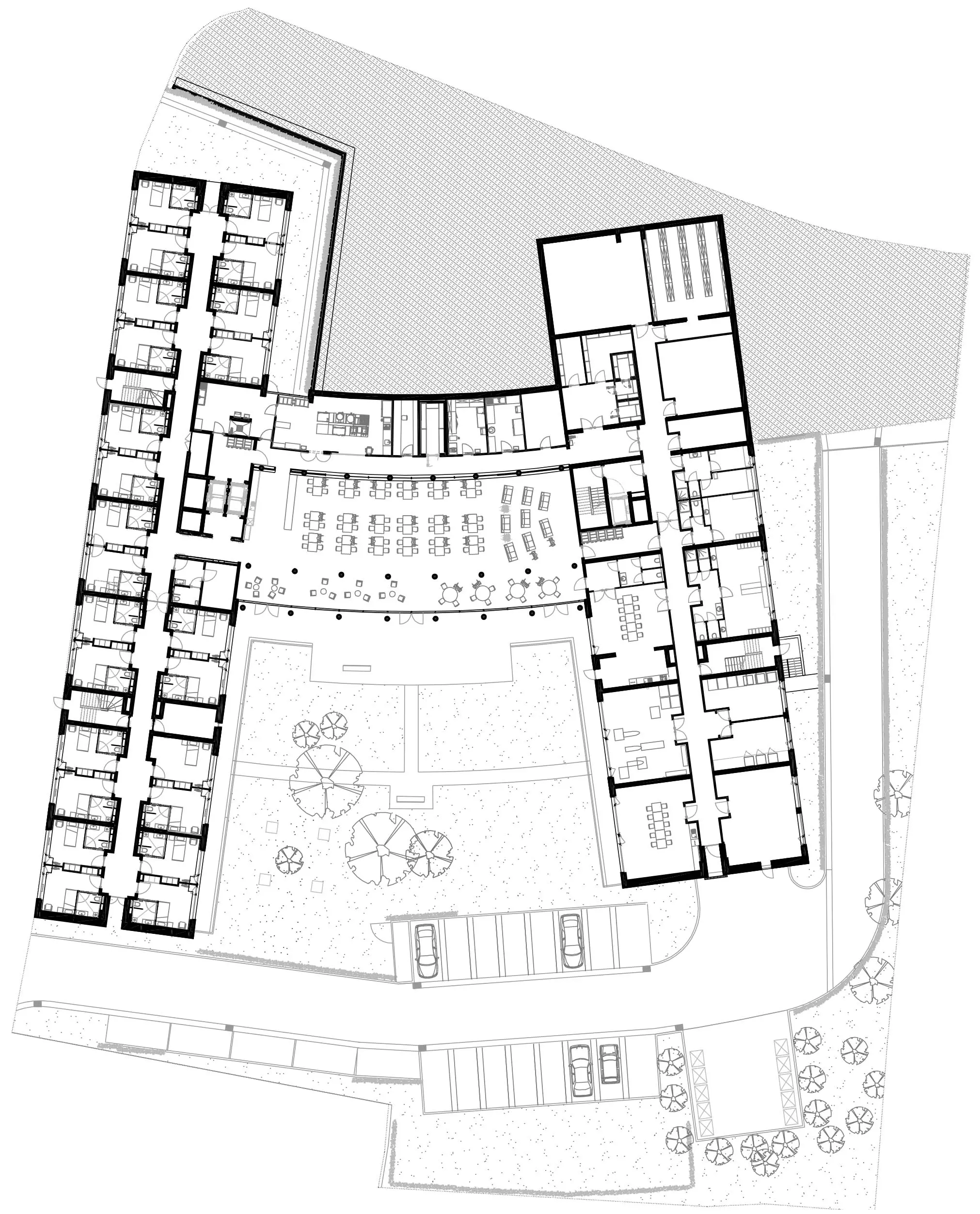 L'objectif principal de ce projet est d'offrir un lieu de résidence à échelle humaine, et ce, malgré la taille du programme proposé (72 chambres et 31 appartements). Pour ce faire, le bâtiment s'inscrit au cœur du village d'Erquelinnes, sur un vaste terrain en pente. L'implantation des différents volumes et le traitement des larges baies permettent de bénéficier de nombreuses vues sur l'environnement extérieur, tout en préservant l'intimité des résidents.