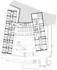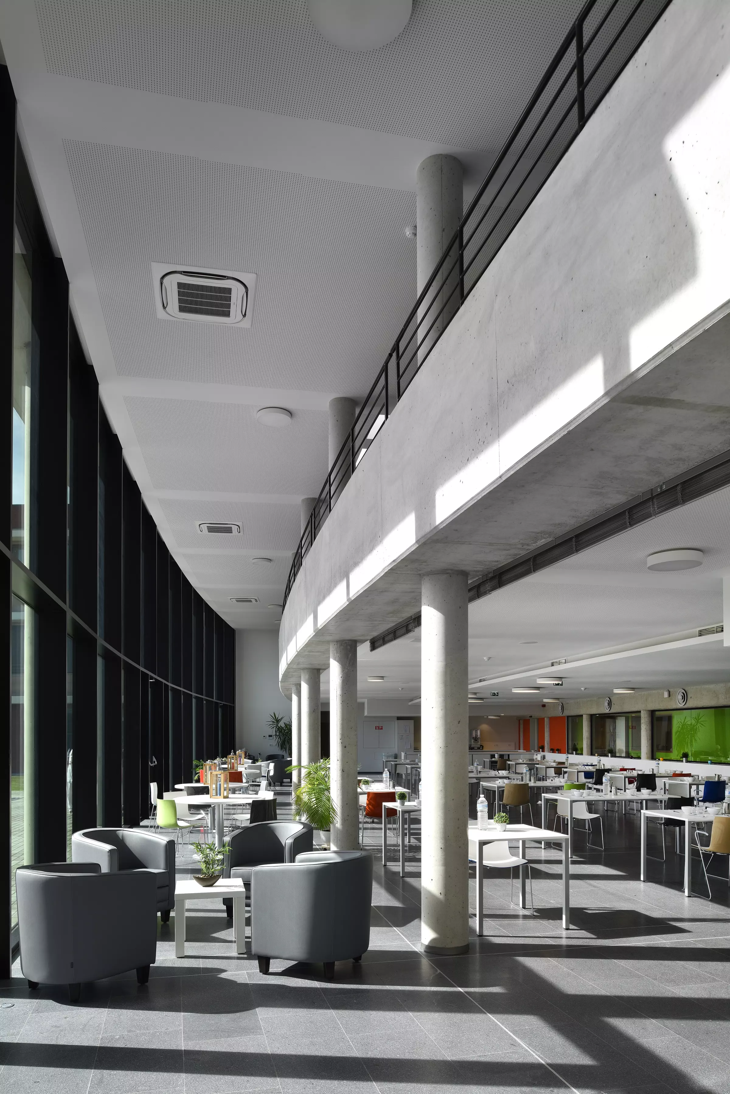 L'intégration de réinterprétations florales, clin d'œil au lieu-dit, permet l'identification des différents niveaux. Ces deux bâtiments sont reliés par un volume en verre de plus petit gabarit abritant l'espace collectif, favorisant une continuité avec l'extérieur, tant par le traitement des ouvertures, de la mezzanine et de l'espace en double hauteur que par des matériaux bruts et naturels.