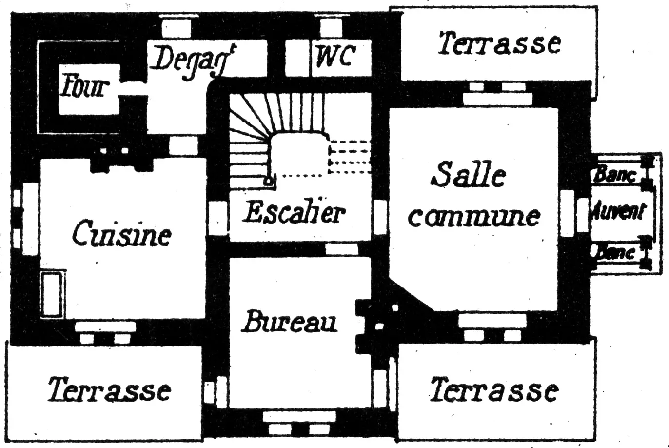 Au départ d'un plan rectangulaire et d'une couverture à deux versants, l'agencement d'évidements et d'ajouts volumiques dote l'ensemble de formes indexées au programme différenciant chaque façade. La cuisine, le four et le WC sont au nord. Les pièces principales donnent sur le hall central et bénéficient de plusieurs orientations dans la course du soleil. La construction est en moellons de grès épincé maçonnés « par relevés », avec seuils, linteaux et chaînages en pierre de taille, sous une couverture en ardoises grises ; les menuiseries sont peintes en marron et blanc. Outre les terrasses couvertes, les éléments remarquables, récurrents chez Hobé, sont le porche et la chambre au-dessus du bureau.
