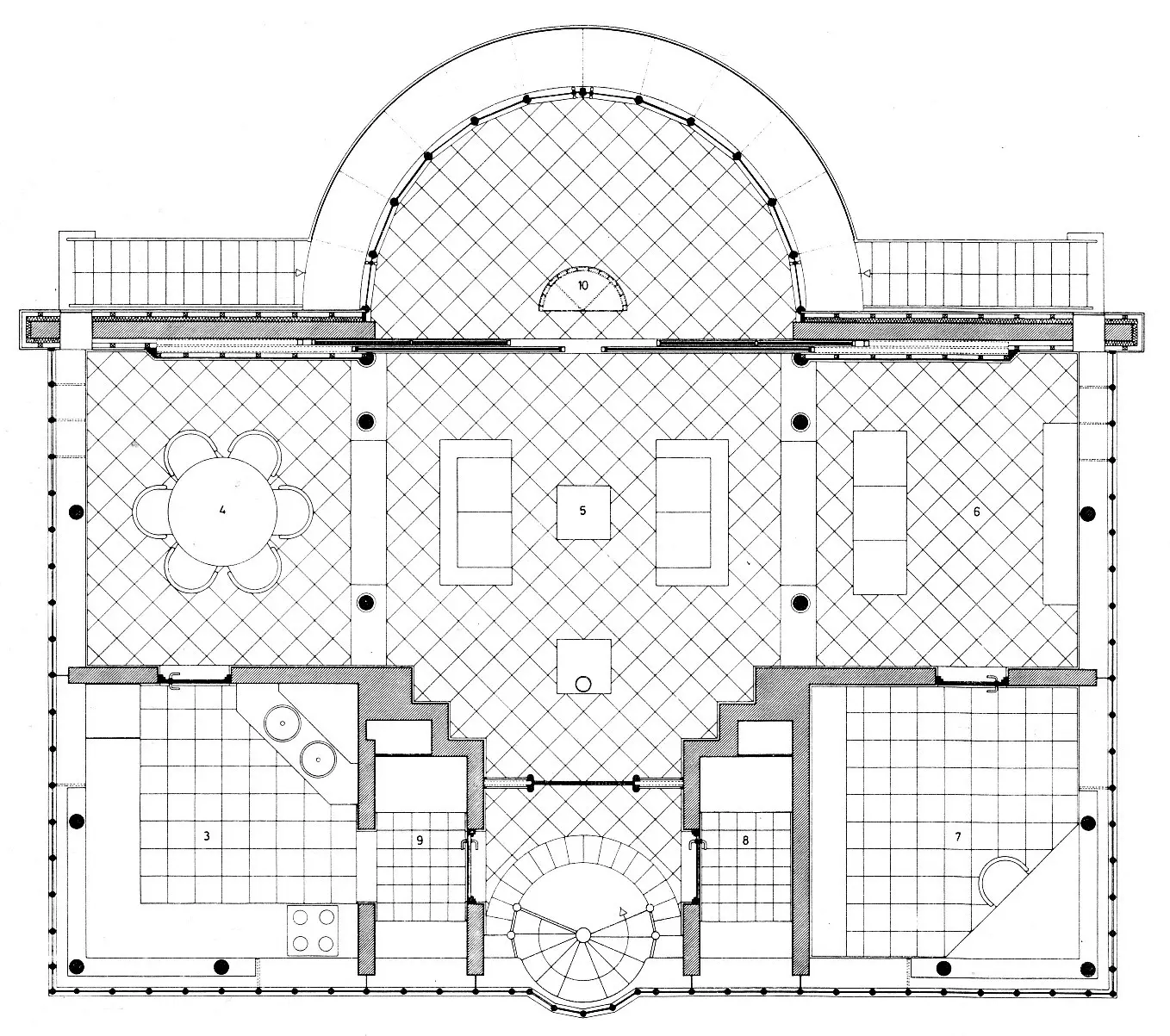Les plasticiens L. Wuidar et G. Dederen interviennent sur les portes coulissantes pour l'un, au niveau du plafond voûté pour l'autre. Le volume est couvert par une toiture à trois versants, caractérisé par un pignon puissant auquel s'adosse la rotonde vitrée. L'ensemble est bardé d'ardoises naturelles. Le plan est symétrique, palladien avec des renvois de vues dans les quatre directions, dans un esprit de monumentalisation domestique.