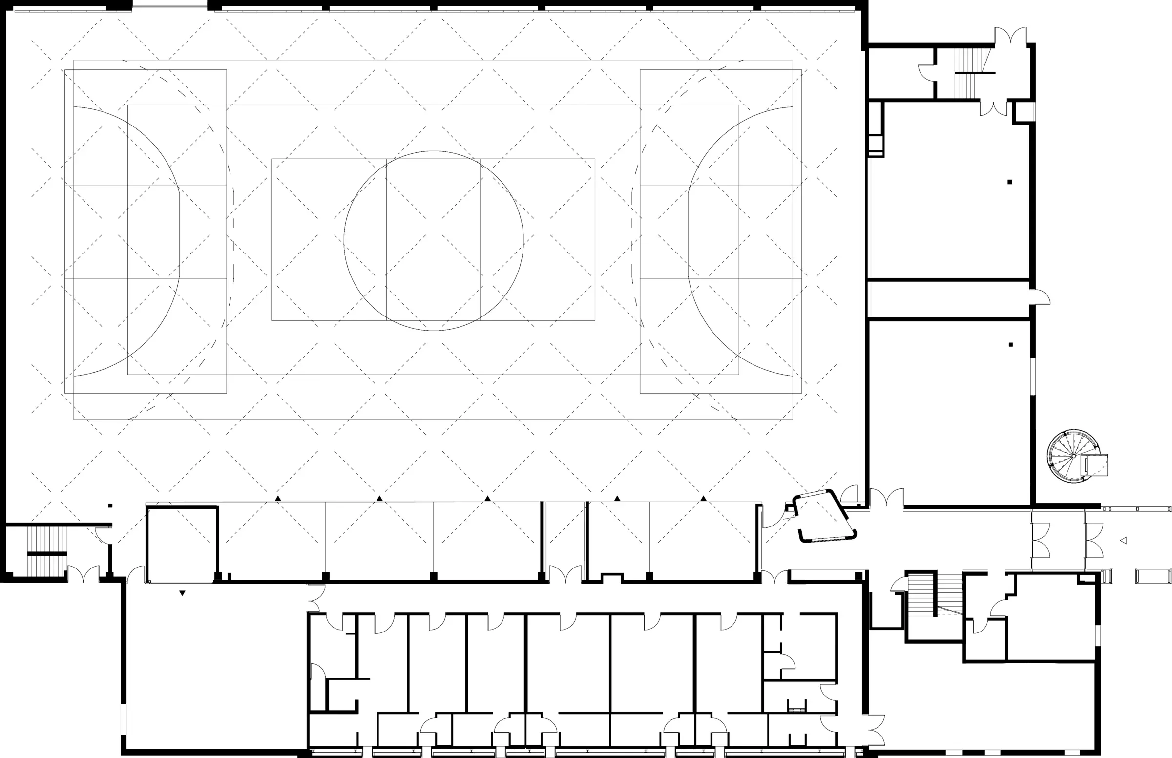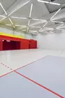 Enfin, la grande salle est mise en conformité pour accueillir des équipes de niveau national, tandis que les couleurs créent un espace vivant et lumineux, ce que le dessin de l'éclairage, une gigantesque trame orthogonale, renforce par sa dynamique abstraite.