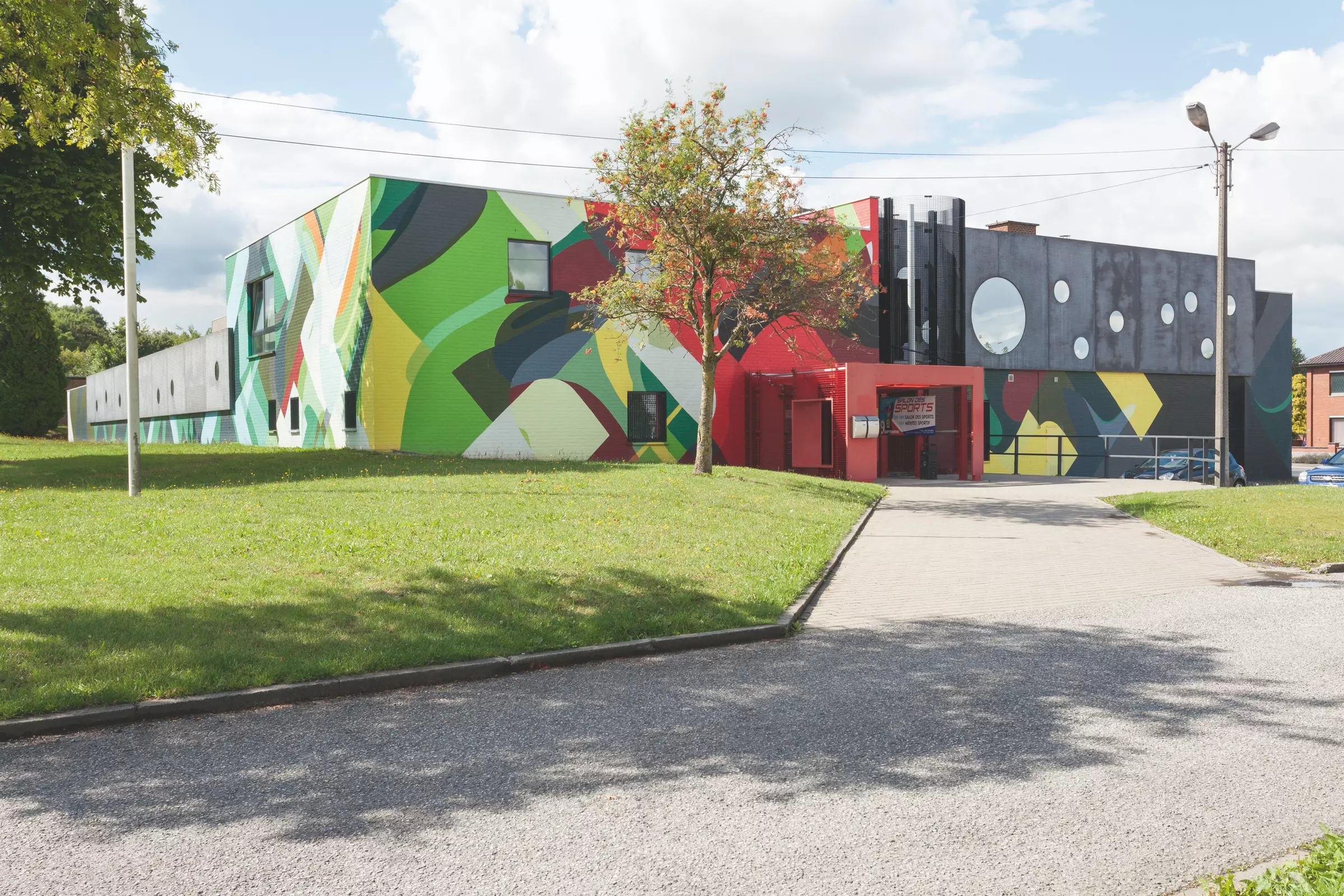 Dans cet objectif, une fresque – référence au street art pratiqué par les jeunes Farciennois – est peinte sur les façades. La deuxième intervention se penche sur l'entrée du bâtiment et crée un dispositif architectural qui déborde de quelques mètres sur l'extérieur et crée un signal et un appel pour le public. La réorganisation des espaces intérieurs marque la séparation des visiteurs et des sportifs. La cafétéria prend désormais place à l'étage, permettant d'avoir une vue plongeante sur les terrains.