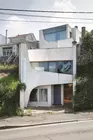 Tirant parti de constructions existantes implantées sur des parcelles contiguës entre deux rues, la maison échelonne ses volumes sur quatre niveaux le long de la pente abrupte du terrain. Alternant surfaces enduites et très larges vitrages, posés à même la maçonnerie, elle évoque, par ses décalages obliques répondant au raccord des deux parcelles et les découpes arrondies de ses parois, le modernisme ludique.