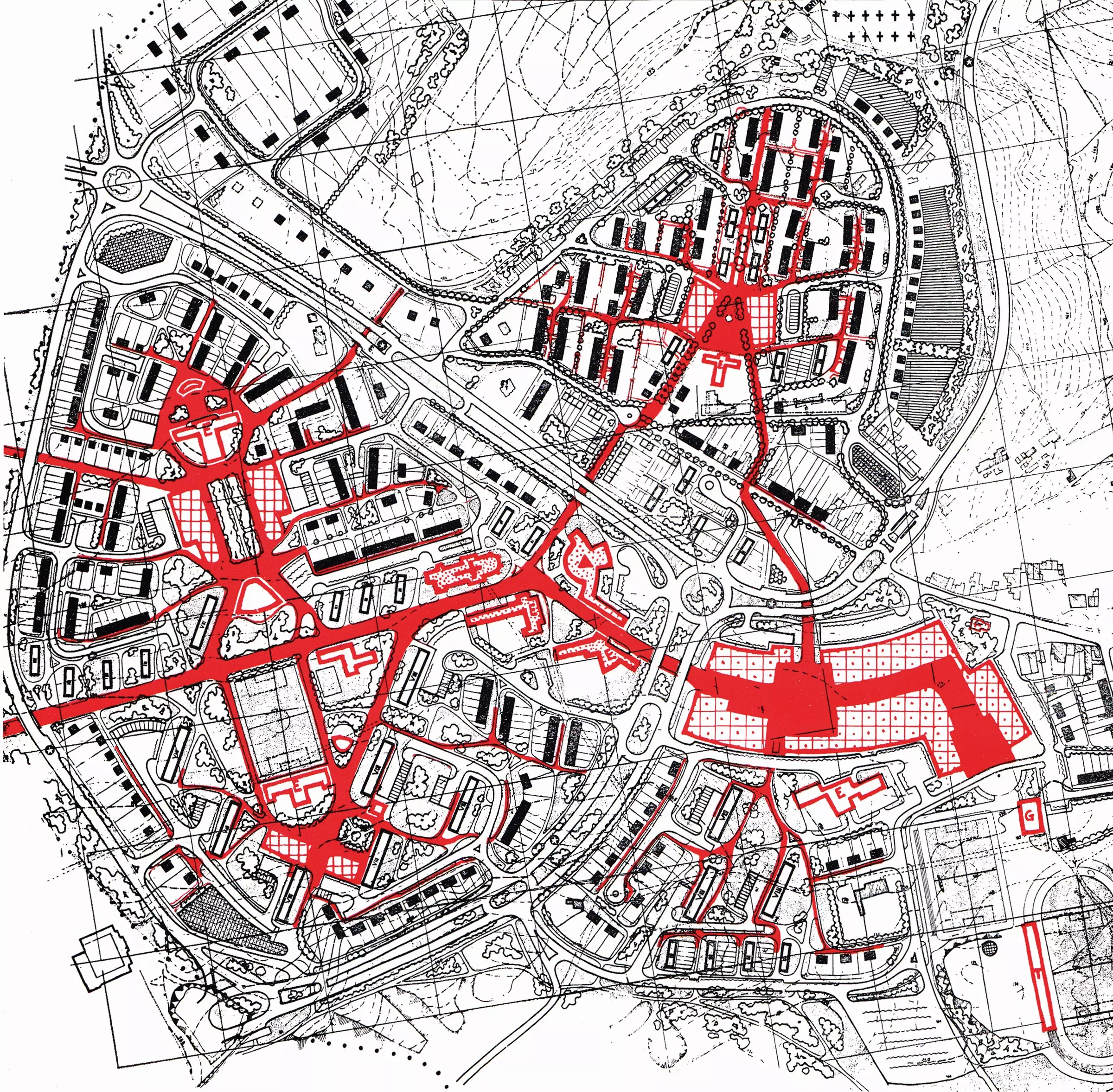 Malheureusement, les immeubles de logements bordant la partie sud-est de ce réseau n'ont jamais été réalisés ou ont été détruits, et le plan de circulation a en partie été modifié, de telle sorte que la trame piétonne a perdu une partie de sa continuité.