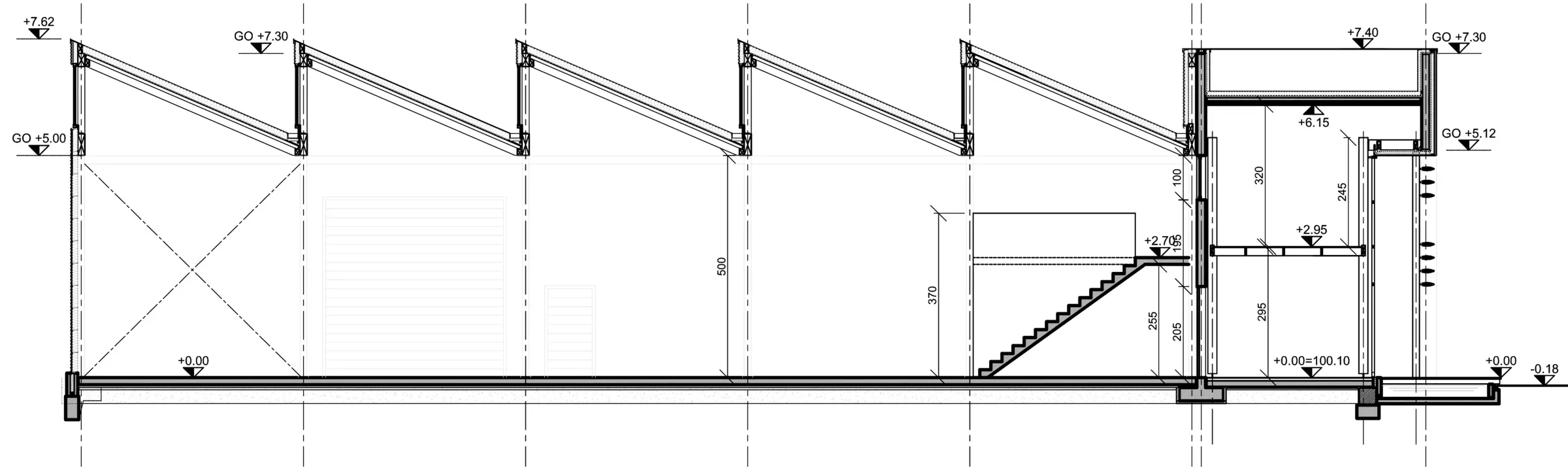 La modernité s'exprime dans la conception des structures : des poutres en treillis, dégageant des portées de 25 m, mais aussi dans les systèmes techniques mis en œuvre (sol chauffant, cogénération) adaptés aux contraintes de travail de l'atelier.