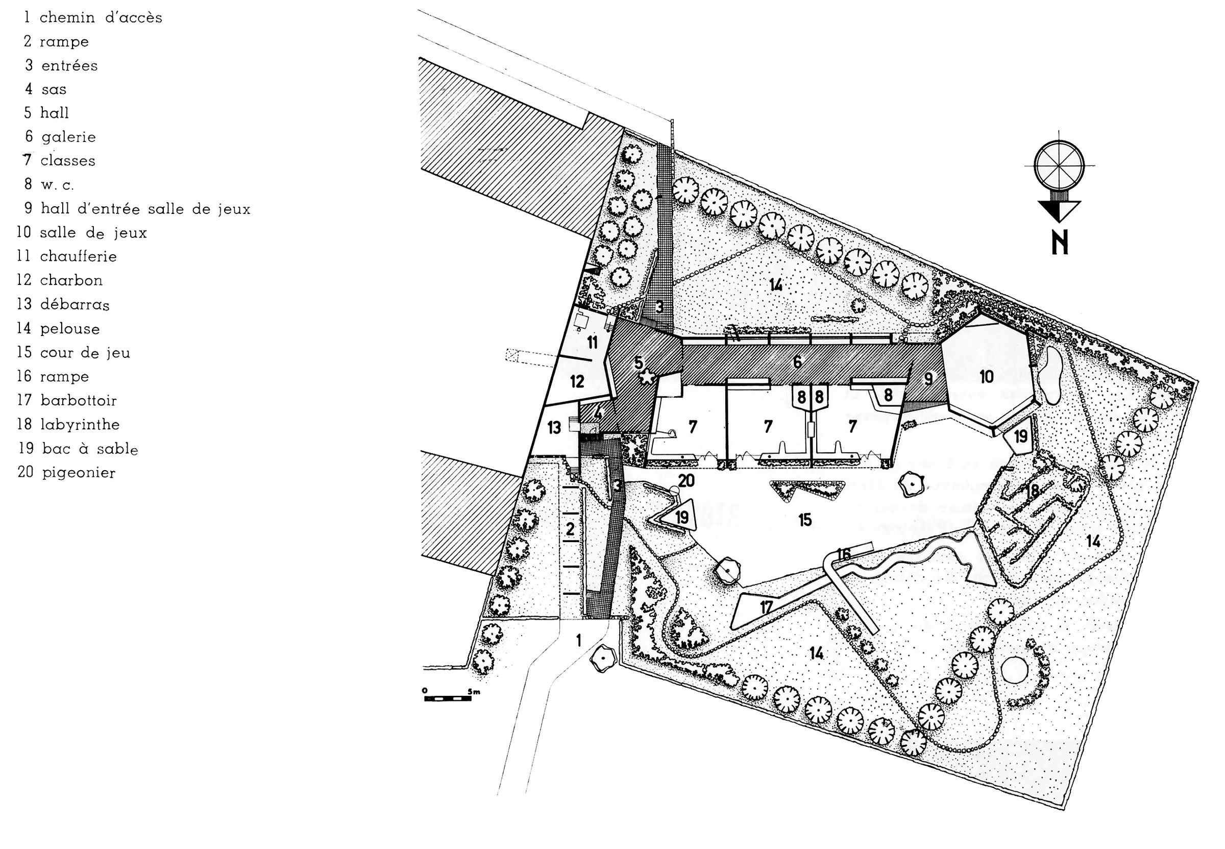 Située en contrebas d'une école primaire existante, l'école gardienne y est rattachée par une rampe légèrement inclinée. L'articulation planimétrique forme un L ouvert. La structure de l'édifice traduit la libre interprétation que se fait Dupuis du programme, chaque pièce exprimant sa propre fonction. Du côté est, près de la rampe, on trouve l'entrée, un atrium, ainsi qu'une série d'espaces techniques, dont le corps central est constitué par un large couloir orienté au sud et donnant accès aux trois salles de classe. Celui-ci peut se transformer en espace dédié au jeu ou au travail.