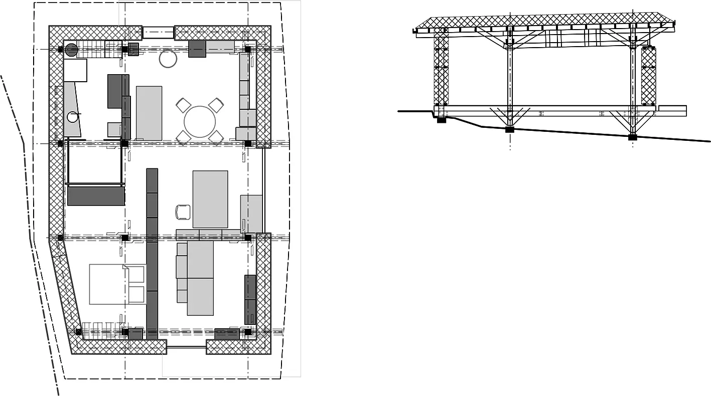 Déposée sur pilotis en bordure d'un bois, cette autoconstruction expérimentale abrite le bureau de l'architecte Staffe, qui utilise ici une technique d'isolation à base de ballots de paille, encore peu connue en Belgique. Réalisé selon les principes de la construction sèche, le bâtiment est constitué d'une ossature en mélèze reposant sur des fondations en gravier damé. La façade en paille, protégée des intempéries par un débordement du toit, forme une masse isolante. Tassés en quinconce entre deux échelles de bois horizontales, les ballots sont couverts d'un enduit extérieur (chaux) et intérieur (argile) posé directement sur la paille lors de stages ouverts au public. Assumant son identité hétéroclite, l'édifice se pose en exemple en termes d'écologie et d'économie de moyens.