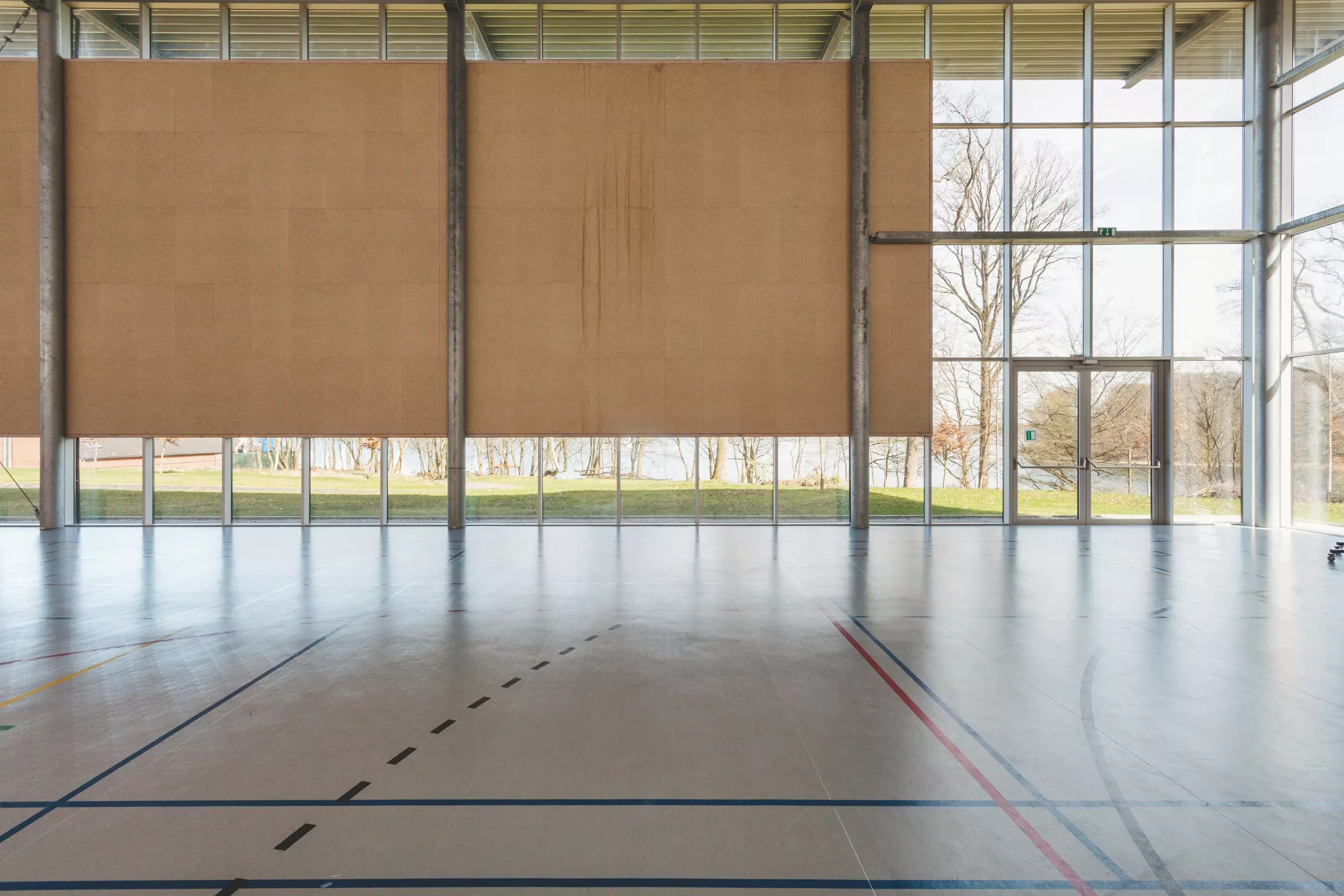 La lumière et la vue sur le lac pénètrent la salle principale, celle de l'omnisports. Le projet est composé de trois salles, une salle omnisports, une salle de danse et arts martiaux et un espace de préparation physique. Chacune a une identité, une ambiance différente selon son implantation, son orientation et son traitement pour répondre à la multiplicité des usages.