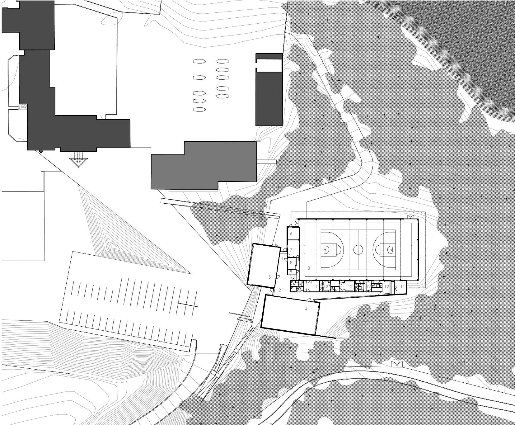 Le centre sportif est situé en amont de la berge, intégré dans un environnement boisé pour préserver la sérénité du lac. Placé sur le plateau existant, le bâtiment accompagne le relief naturel, à la frontière entre la forêt, le terre-plein et le lac.