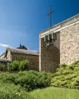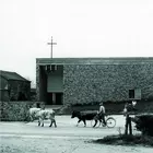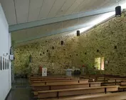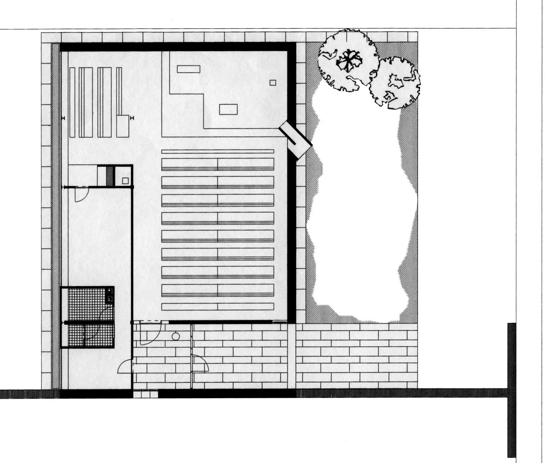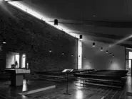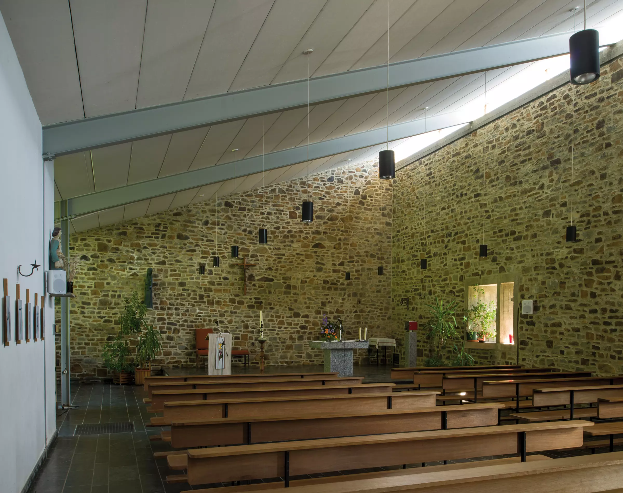 Côté arrière, la façade peu élevée s'ouvre complètement sur le paysage champêtre et apporte l'éclairage nécessaire à l'espace de célébration caractérisé par le dialogue créé entre parois blanchies et murs en moellonnage nu. La zone de l'autel bénéficie en outre, côté rue, d'une percée visuelle que manifeste une saillie oblique en béton brut.