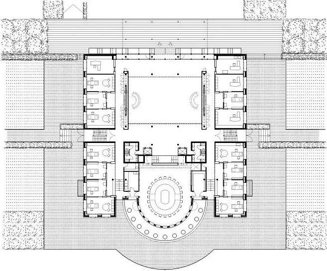 Pour ce grand bâtiment en bordure d'une vaste forêt protégée, le maître d'ouvrage demande de s'inspirer de la villa Rotonda de Palladio ainsi que de la Maison-Blanche. La difficulté du projet a été de satisfaire ces désirs tout en concevant de l'architecture contemporaine. Le bâtiment se veut simple, raffiné, ample par ses proportions et ses hauteurs de plafonds.