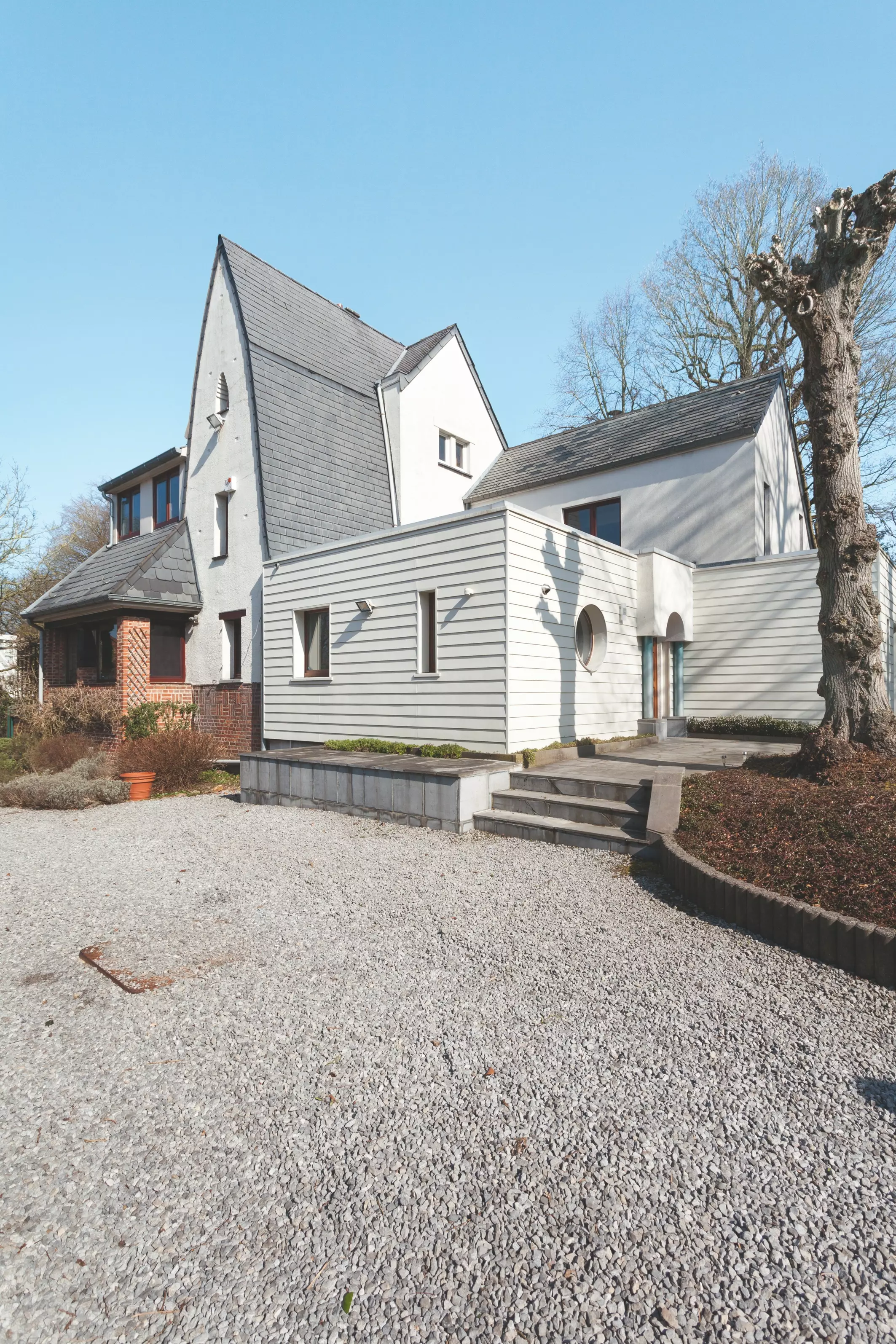 C'est dans cette démarche que ce projet est conçu. L'articulation globale de la villa repose sur l'imbrication de deux volumes. Les façades, aux ouvertures étroites et sobres, reflètent une tendance intimiste de l'architecture de l'entre-deux-guerres. Dans le soubassement, on peut voir un jeu sur les appareils de briques pour souligner un registre.