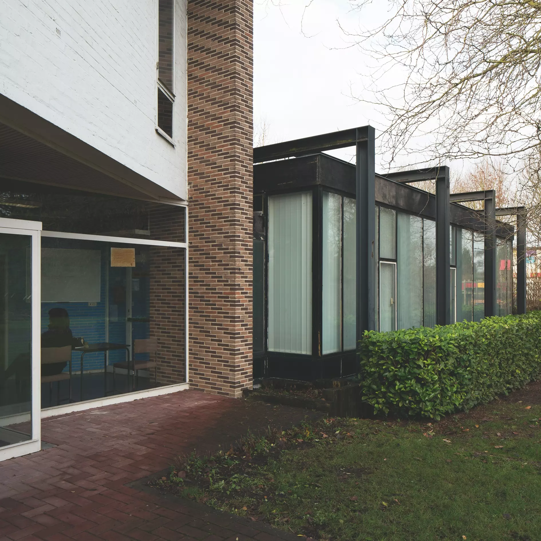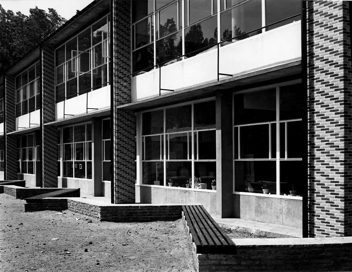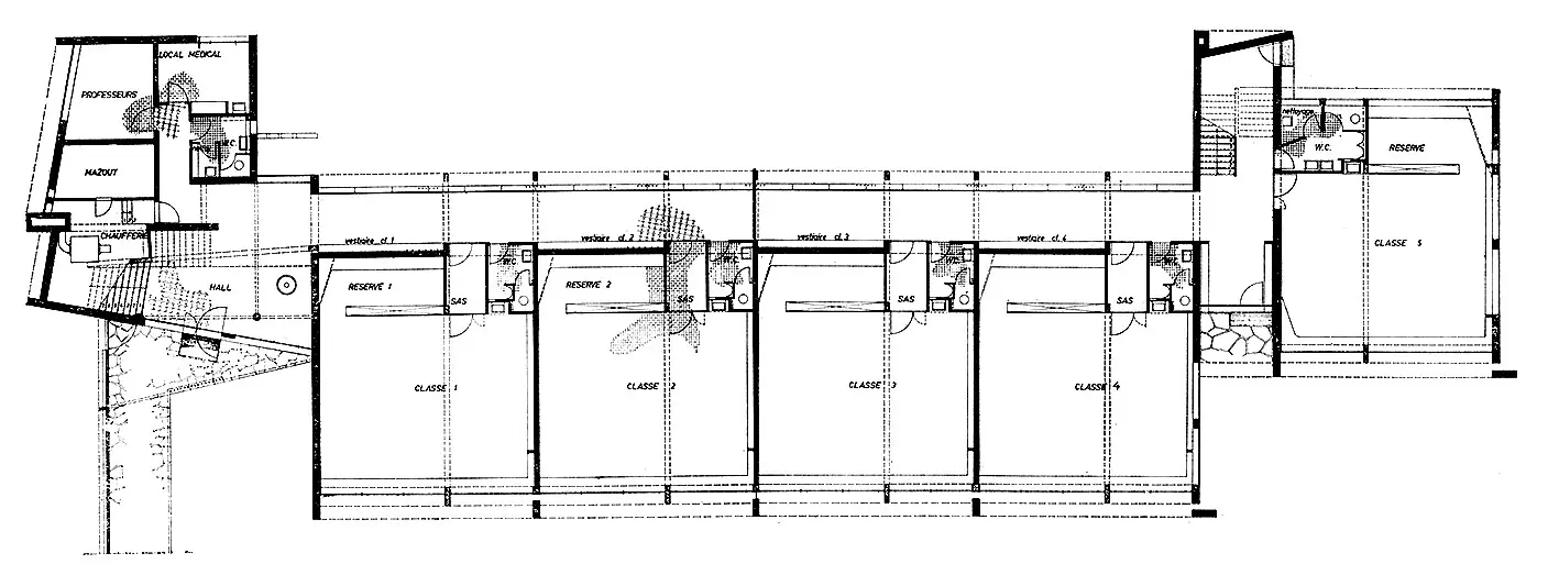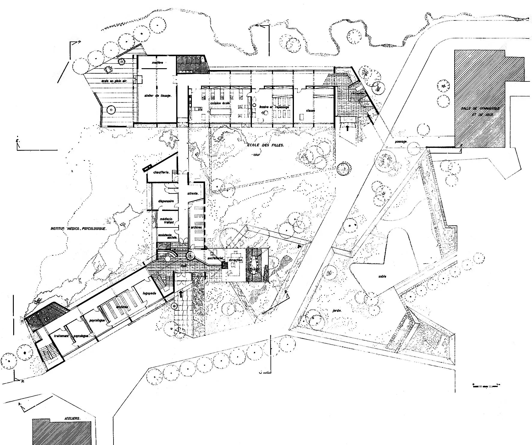 Le centre médico-psychologique et l'école des filles, derniers bâtiments réalisés, sont reliés par un jeu d'auvents aux puissantes qualités expressives.