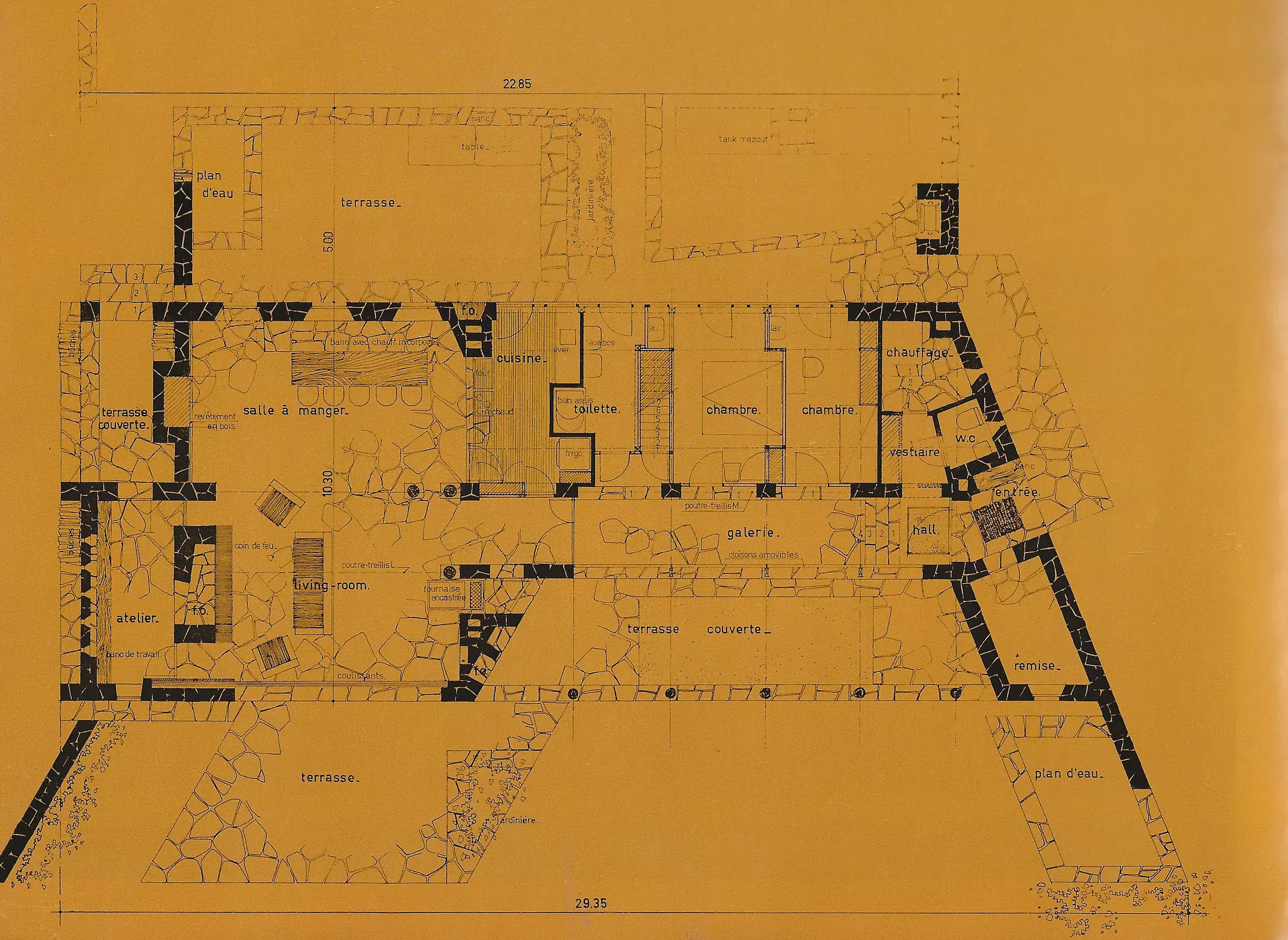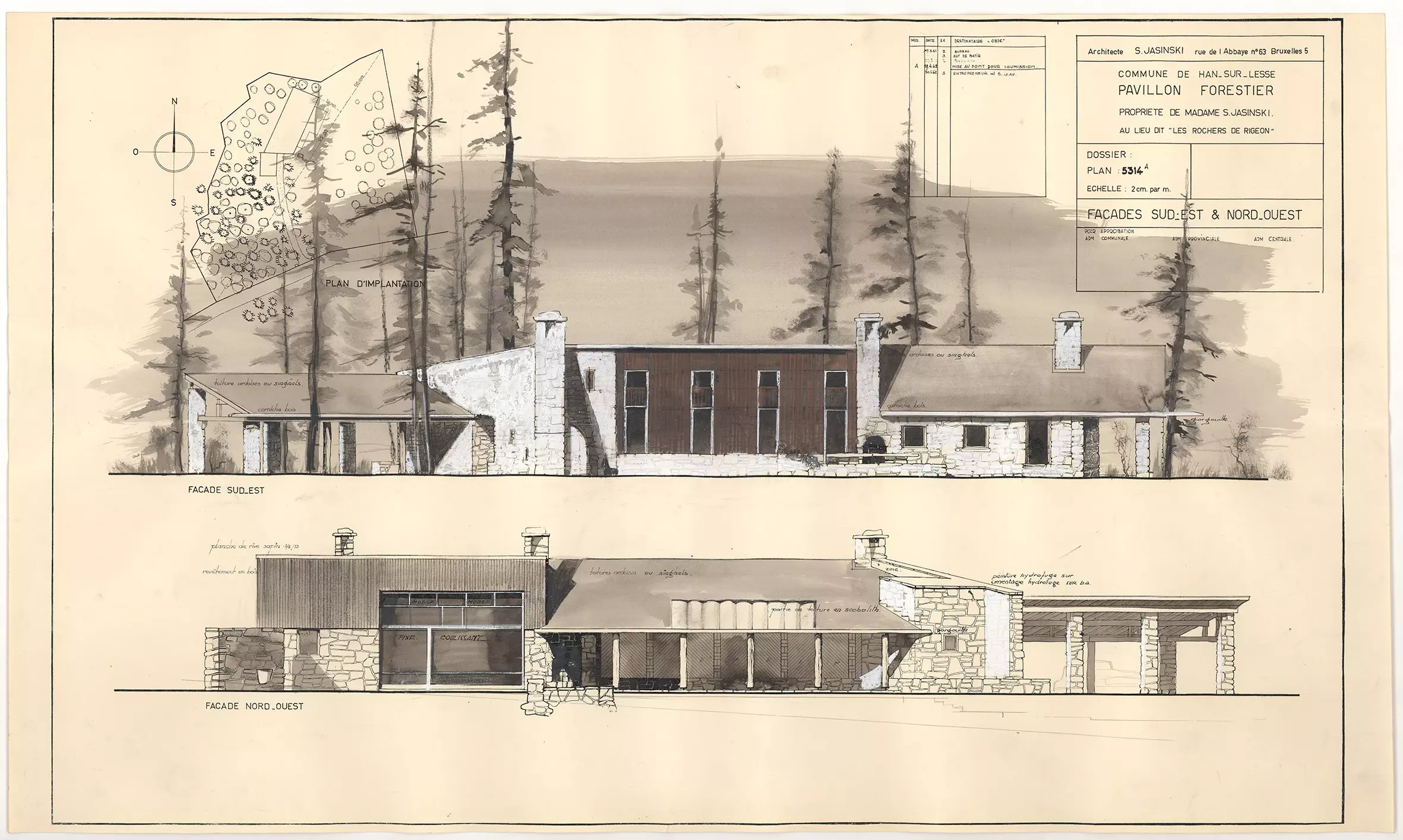 Refuge pour l’architecte et sa famille, Stanislas Jasinski construit cette habitation dans un milieu boisé, près d’une falaise offrant une vue sur plusieurs kilomètres. La construction est dissimulée entre les frondaisons de pins noirs. Développée en longueur, son aspect pavillonnaire est souligné par l’usage de matériaux locaux (murs en moellons de grès de l’Ourthe provenant d’une carrière voisine, éléments en bois issus de la coupe des arbres présents sur le site). Une partie de la façade Sud-Est s’ouvrant sur une terrasse est réalisée avec de minces panneaux métalliques préfabriqués et isolés. Cette dérogation aux normes locales a permis de récupérer de la surface à l’intérieur. Les toitures à plusieurs versants de faible pente sont couvertes d’ardoises et appuyées sur une poutre centrale qui traverse la construction. L’intérieur est également en accord avec ce parti, des murs en moellons peints en blanc, des colonnes issues de troncs d’arbres, des plafonds en lattes de bois et un sol couvert de grandes dalles de pierre. Le langage architectural témoigne de sa capacité d’adapter la construction au contexte en essayant d’inscrire l’habitation dans la nature. Ainsi, la façade Nord-Ouest vers le jardin est très ouverte en mettant en évidence la continuité entre l’intérieur et l’extérieur alors que la façade latérale, vers le chemin d’accès, est un mur en moellons quasi aveugle dans lequel s’ouvre une porte qui ressemble à l’entrée d’une grotte. Refuge familial plongé dans la nature, il sera la dernière demeure de l’architecte qui y décède en janvier 1978.