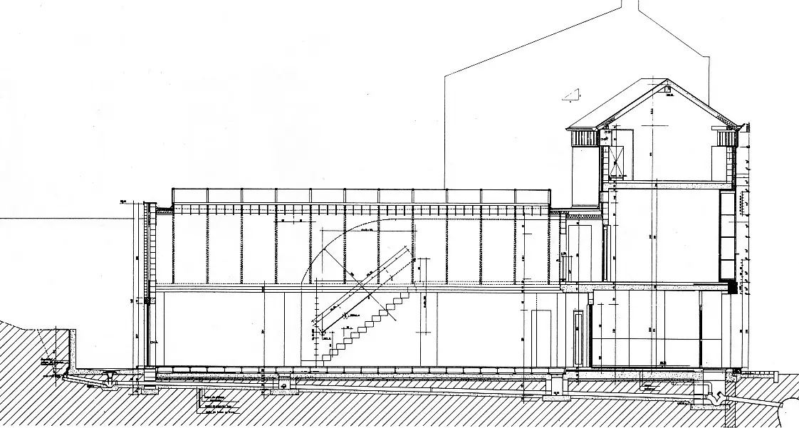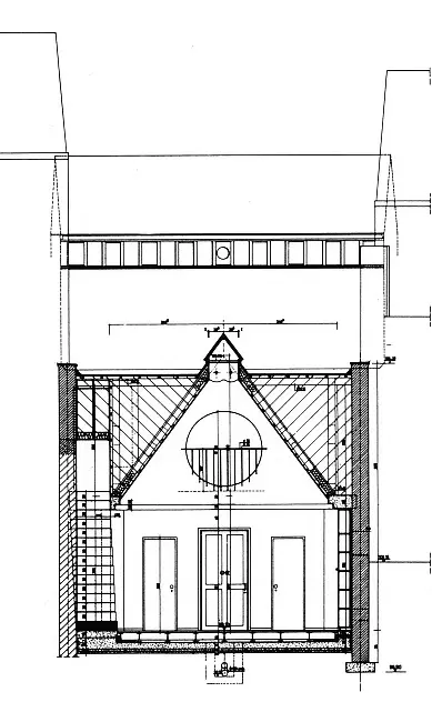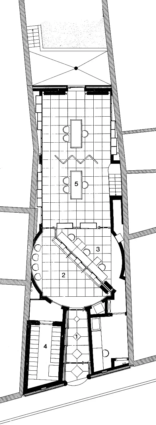 La composition du plan est axiale, basée sur un enchaînement d'espaces de statuts fonctionnel et compositionnel très marqués : un vestibule d'entrée, un espace-rotonde pour l'accueil des clients, une salle-vaisseau placée en arrière-bâtiment pour l'espace protégé des bureaux. Cette dernière est magistrale, avec son plafond à double versant aigu et son lanterneau faîtier continu.