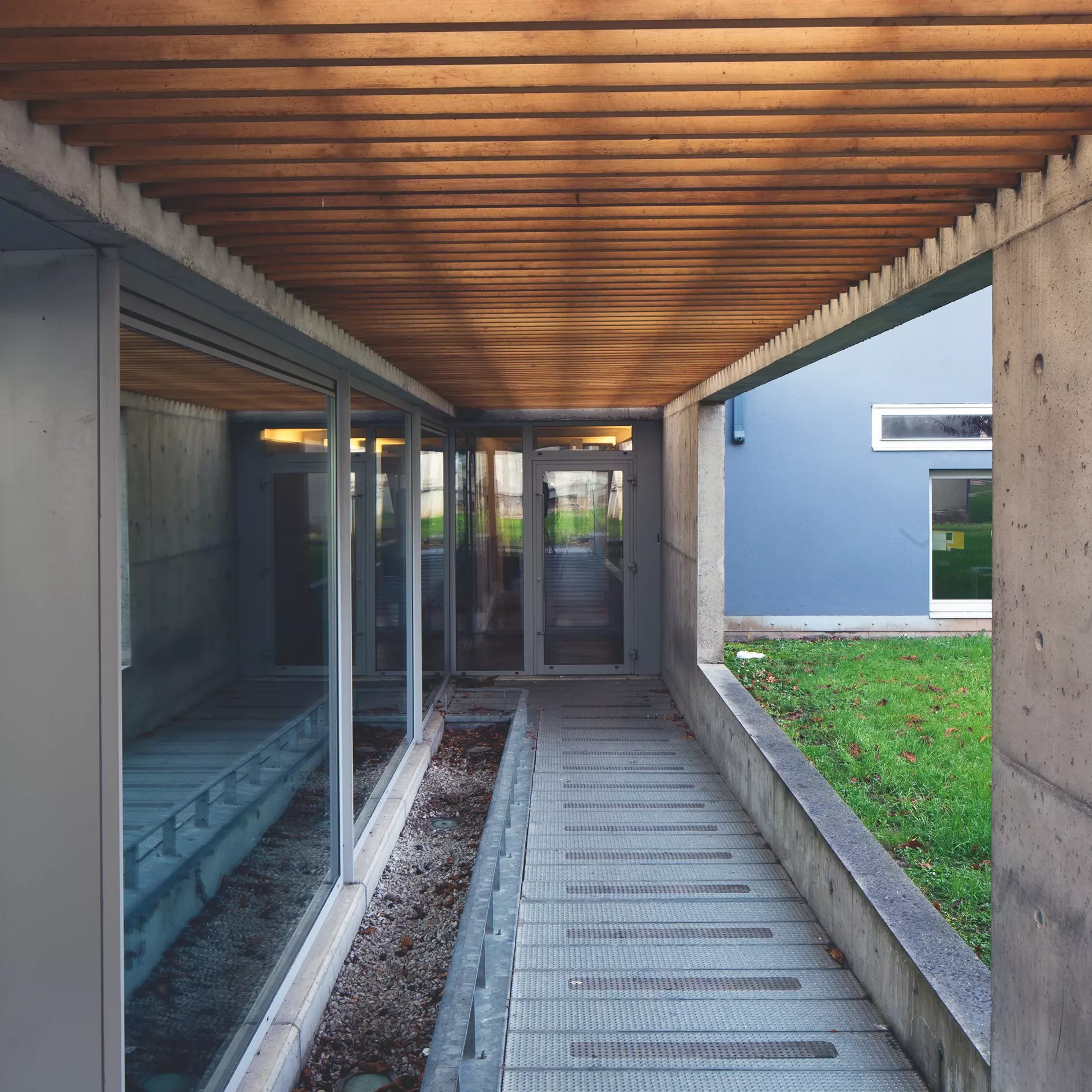 La nouvelle construction se démarque. Sa volumétrie et son implantation accentuent les fluidités visuelles. Le contexte, la végétation et les bâtiments qui l'entourent participent aux espaces intérieurs grâce aux cadrages des ouvertures.